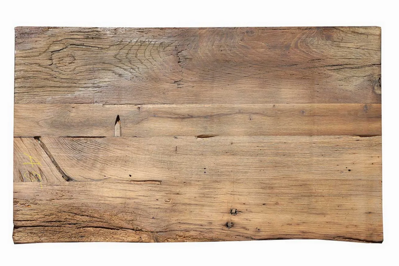 Diese besondere Holzplatte ist aus Alteiche gefertigt. Ihr Name verrät, dass dieses Holz bereits in der Vergangenheit verwendet wurde und nun ein zweites Leben erhält. Die rustikale, dunkelbraune Farbe dieser Tischplatte erzählt von ihrer Geschichte und den Erlebnissen, die sie bereits hinter sich hat. Die unbehandelte Oberfläche unterstreicht den natürlichen Charme. Die Tischplatte besteht aus drei Planken in unterschiedlichen Breiten, die harmonisch zusammengefügt sind, sodass sie den Eindruck erweckt, aus einem Stück gefertigt zu sein. Die tiefbraune Färbung wird durch dunklere Maserungen, fast schwarze Risse und Astlöcher zusätzlich betont, was ihr einen einzigartigen Charakter verleiht.