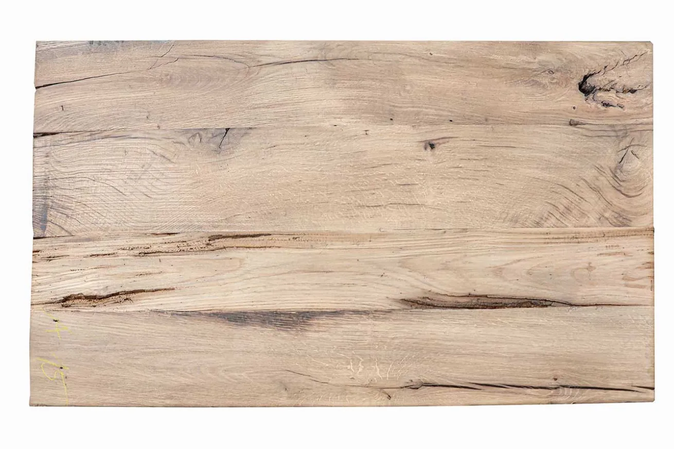 An den dunkleren Bereichen am Rand und in der Tischmitte sind Gebrauchsspuren zu sehen, da es sich bei diesem Produkt um recyceltes Eichenholz handelt, das widerverwendet wurde.