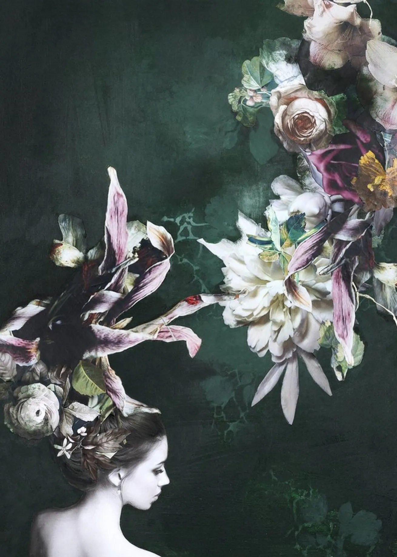 Dieser dunkle Aluminiumdruck mit schwarzem Rahmen zeigt ein etwas ausgefallenes Motiv. Unten links ist eine Frau mit so heller Haut, dass ihre schwarze Haarffarrbe hervorstechen kann. Tut sie aber nicht wirklich, da sich diese mit dem dunkelgrünen Hintergrund vereint. Aus dem Kopf und oben rechts sind viele wunderschöne Blumen dargestellt, die sich alle einen Weg in die Mitte nach unten machen.