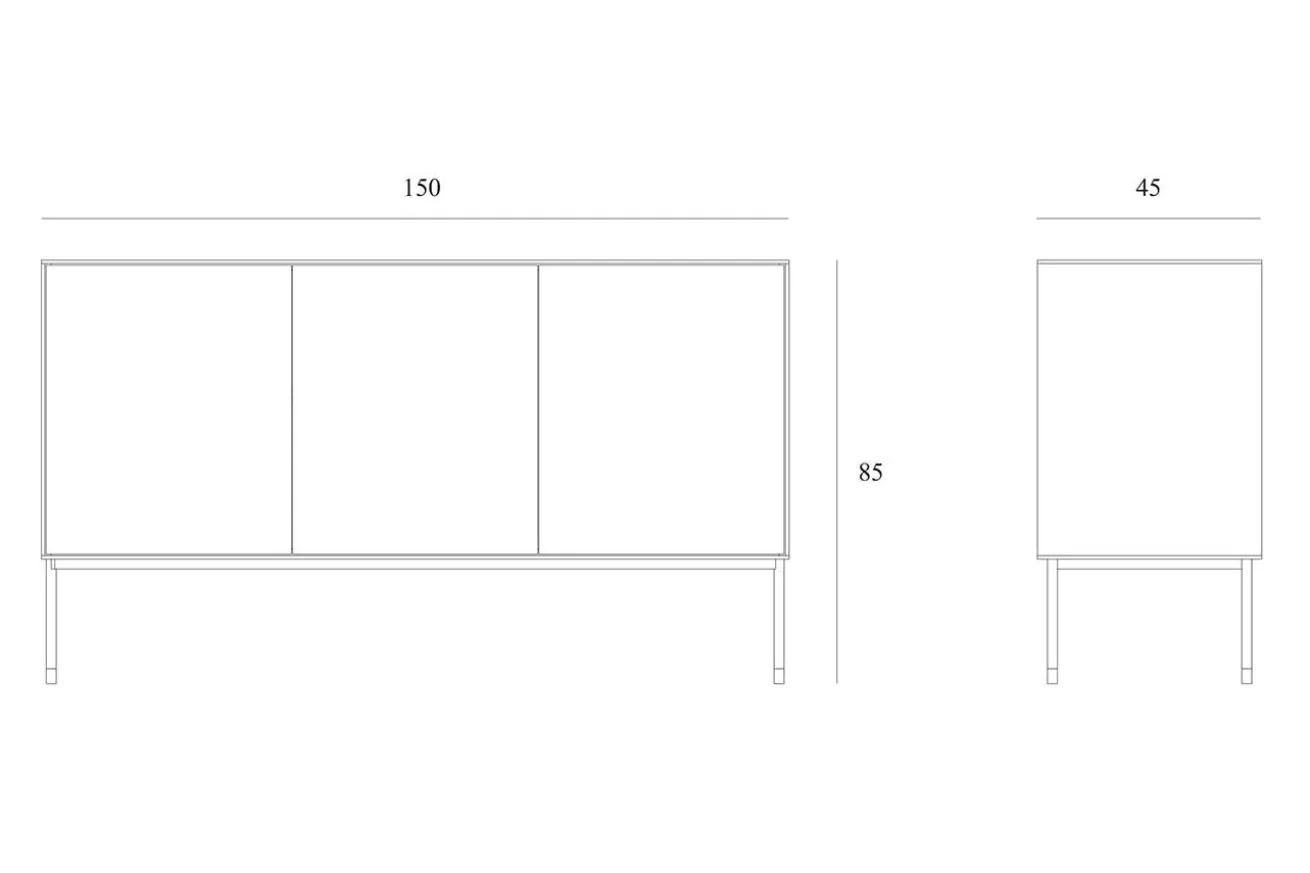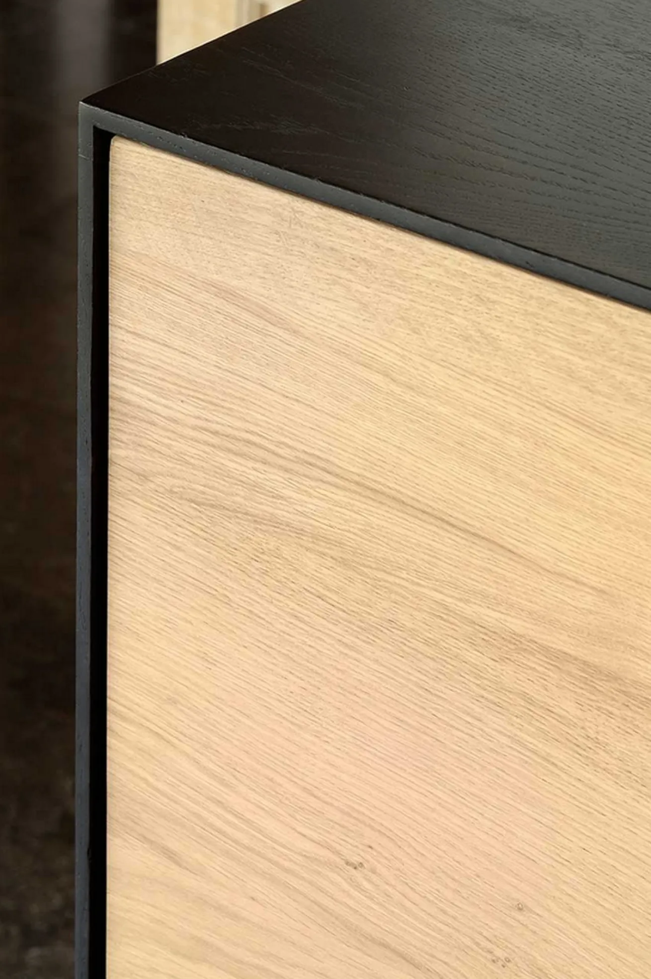Die Kommode aus Eichenholz heißt Blackbird, weil sie einen schwarzen Holzrahmen hat, der Schubladen und Schränke zusammenhält und elegant einrahmt. Das Möbelstück hat eine Breite von 150cm, eine Höhe von 85cm und eine Tiefe von 45cm. Die natürliche Farbe des Holzes wurde hier beibehalten. Die Oberfläche des Lowboards aus Eichenholz wurde zum Schutz geölt. Im Gesamten besteht das Sideboard aus 3 nebeneinander liegenden Türen, die für genügend Stauraum sorgen.