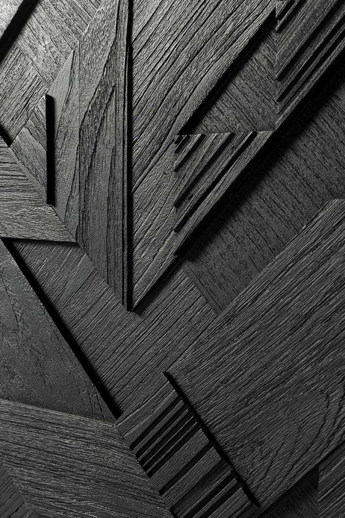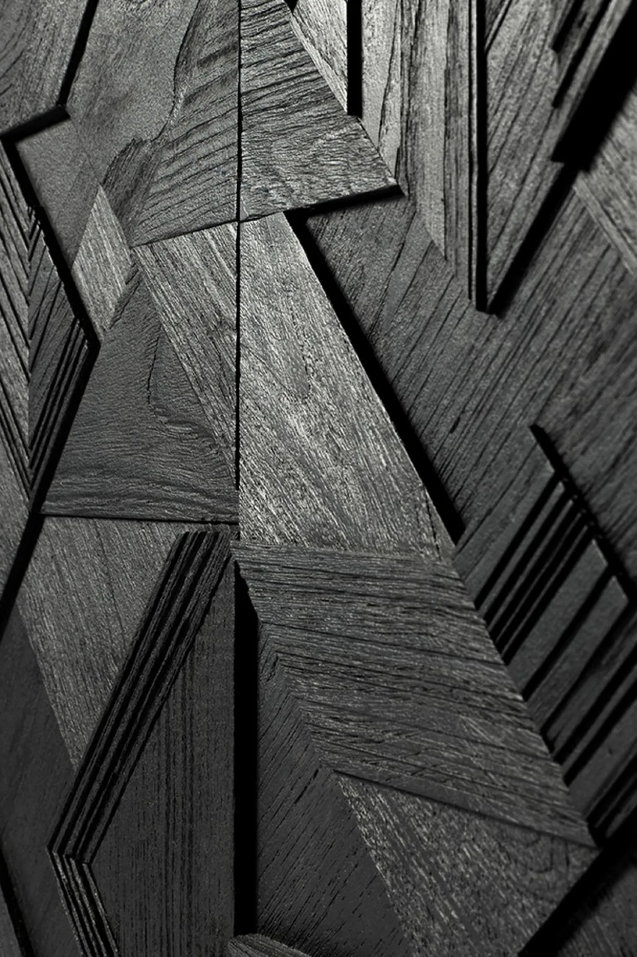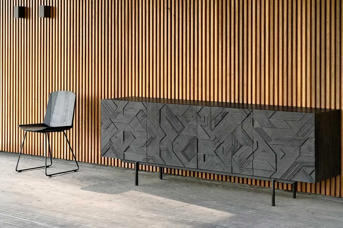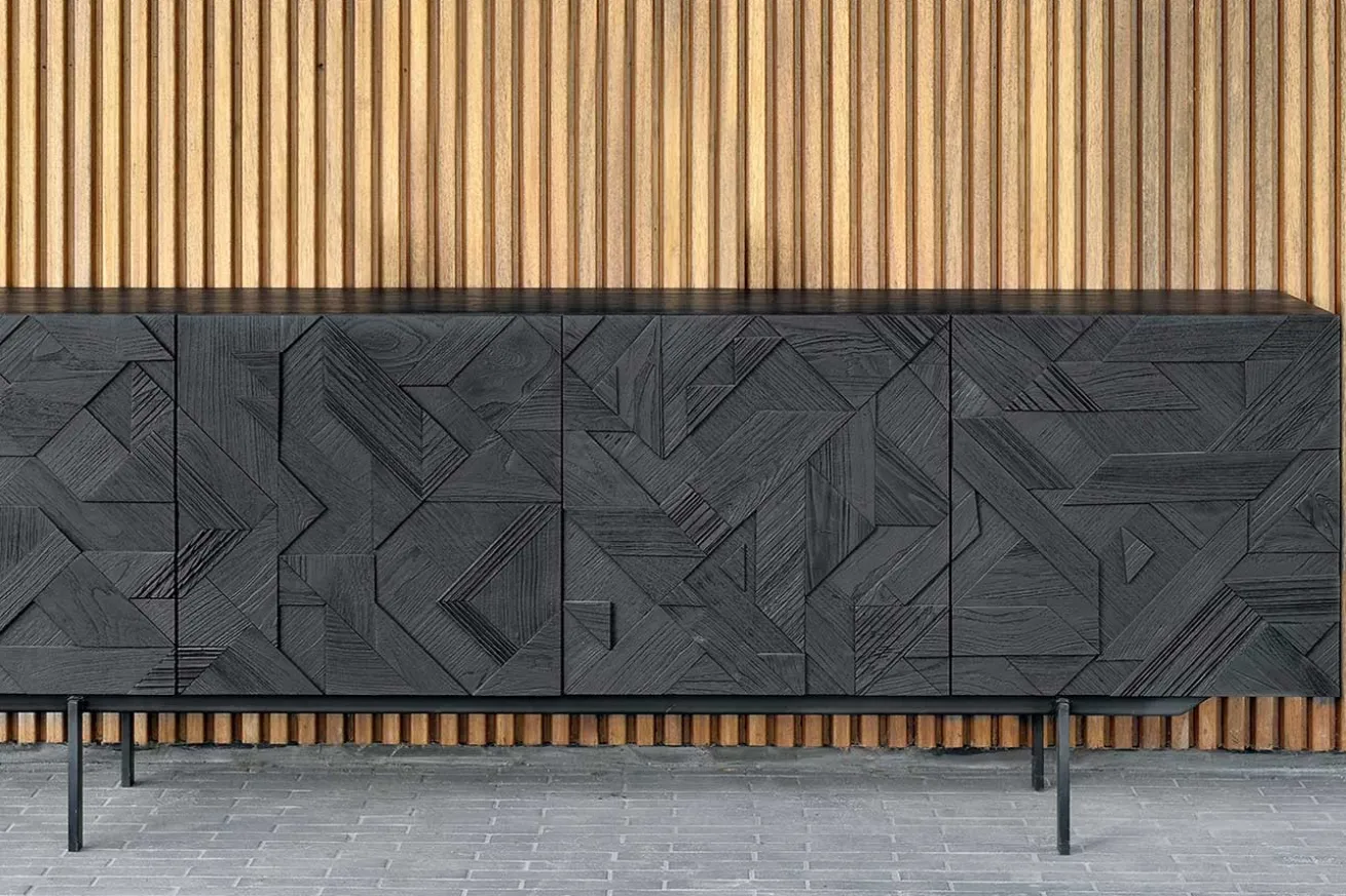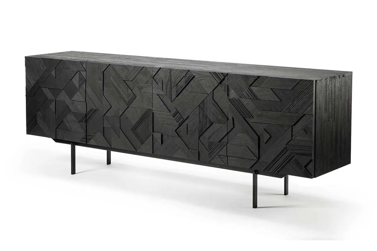Designer Alain van Havre vereint Kreativität und mathematische Präzision in einer beispiellosen Komposition, die sich auf eine einzigartige archaische Form konzentriert. Ein Dreieck bildet die Grundlage aller Muster und wird platziert und repliziert, um etwas wirklich visuell Anziehendes zu schaffen. Durch die Verwendung mehrerer Ebenen wird ein Gefühl von Tiefe und Dynamik in der komplexen Anordnung erzeugt. Bewegung und Wärme werden hinzugefügt, indem die natürlichen Eigenschaften des Holzes weiter perfektioniert werden. Kombiniert diese unterschiedlichen und kontrastierenden Eigenschaften in einem unkonventionellen Design, das sich vom Bekannten löst und ein einzigartiges und faszinierendes Herzstück schafft. Das Graphic Sideboard besteht aus Teakholz und ist schwarz lackiert. Es hat eine Breite von 224cm, eine Höhe von 80cm und eine Tiefe von 45cm. Dank der vier filigran gearbeiteten Füße steht der Korpus des Möbelstücks im Vordergrund. Einfarbige Möbelstücke wie dieses lassen sich in Räumlichkeiten perfekt integrieren, die in neutralen Tönen eingerichtet sind und denen ein Sideboard mit viel Stauraum fehlt, sei es ein Ess- oder ein Schlafzimmer. Das Möbelstück aus Teak in schwarz ist vielseitig nutzbar.