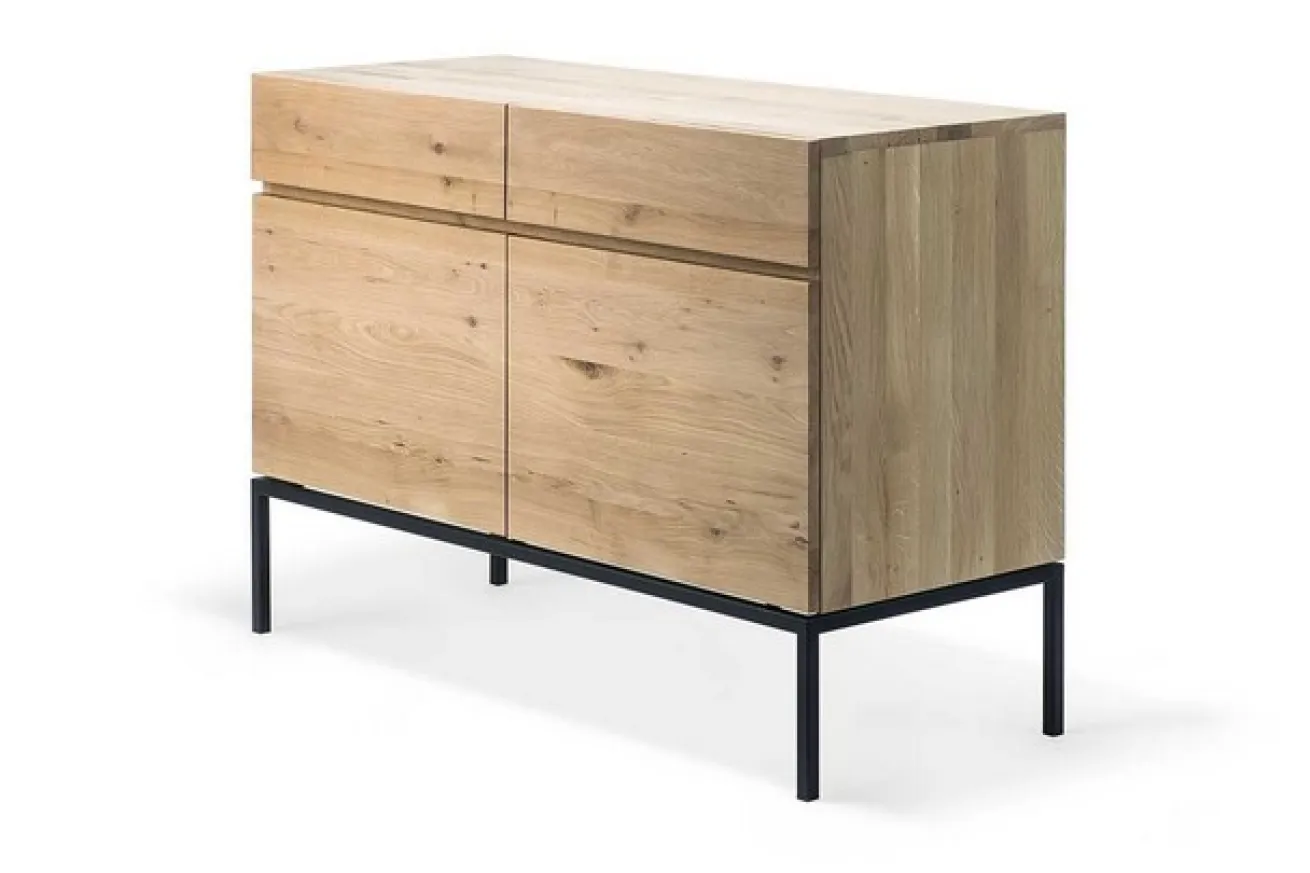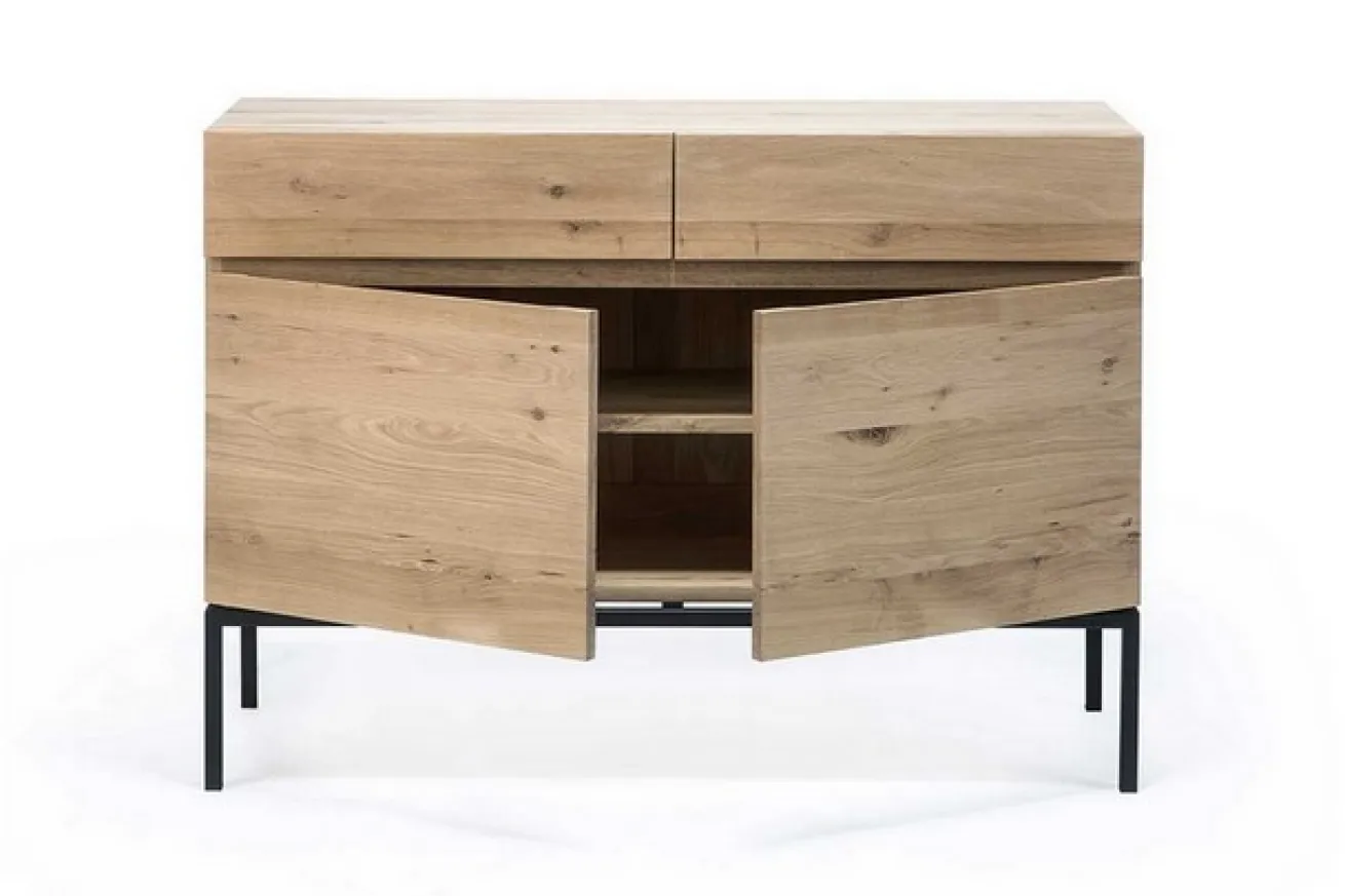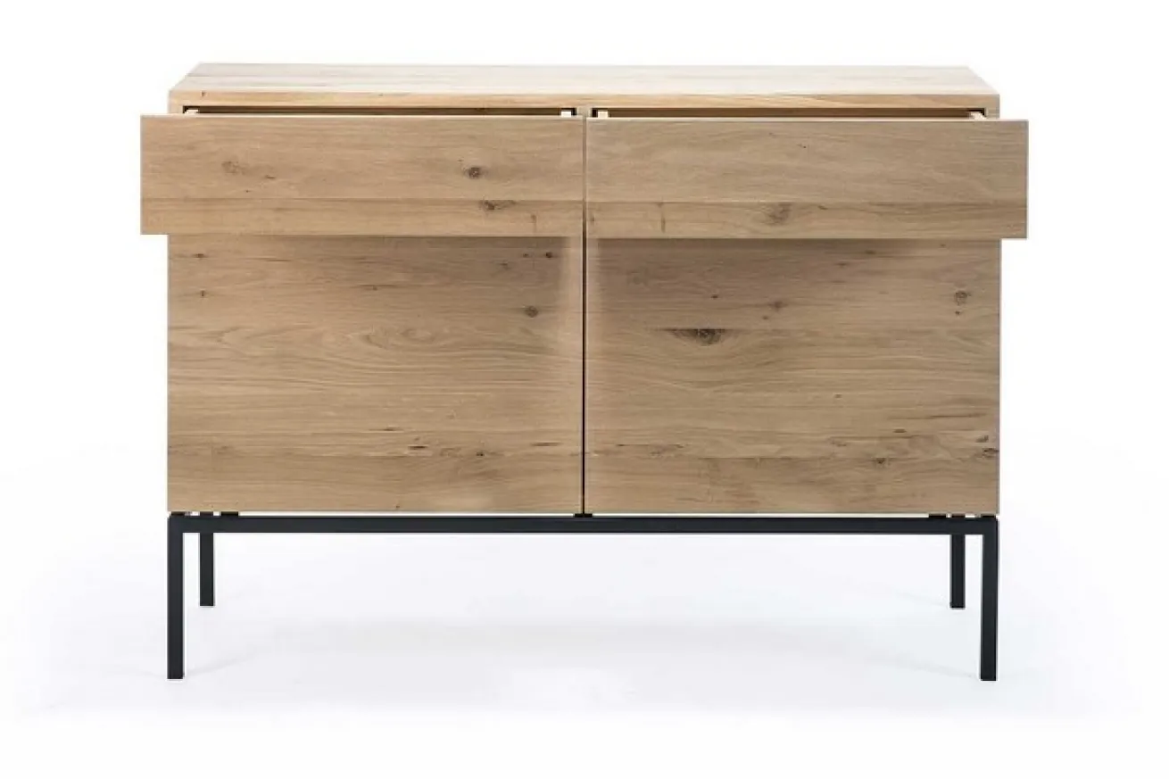Die Kommode ist aus massivem Eichenholz und hat eine Breite von 110cm, eine Höhe von 78cm und eine Tiefe von 45cm. Sie hat zwei Schranktüren, die sich ohne Griff öffnen lassen. Das Innenleben dieser ist durch einen Einlegeboden aufgeteilt, wodurch sich der Stauraum unterschiedlich verwenden lässt. Über den Türen befinden sich zusätzlich zwei Schubladen, die für extra Verstauungsmöglichkeiten sorgen. Das Möbelstück sticht durch seine natürliche Farbe mit gleichmäßiger Maserung heraus. Das Ligna Sideboard hat aufgrund seiner schwarzen Edelstahlbeine eine sehr cleane Ausstrahlung. Es bietet perfekte Aufbewahrungsmöglichkeiten für Küche, Wohnzimmer oder Esszimmer.