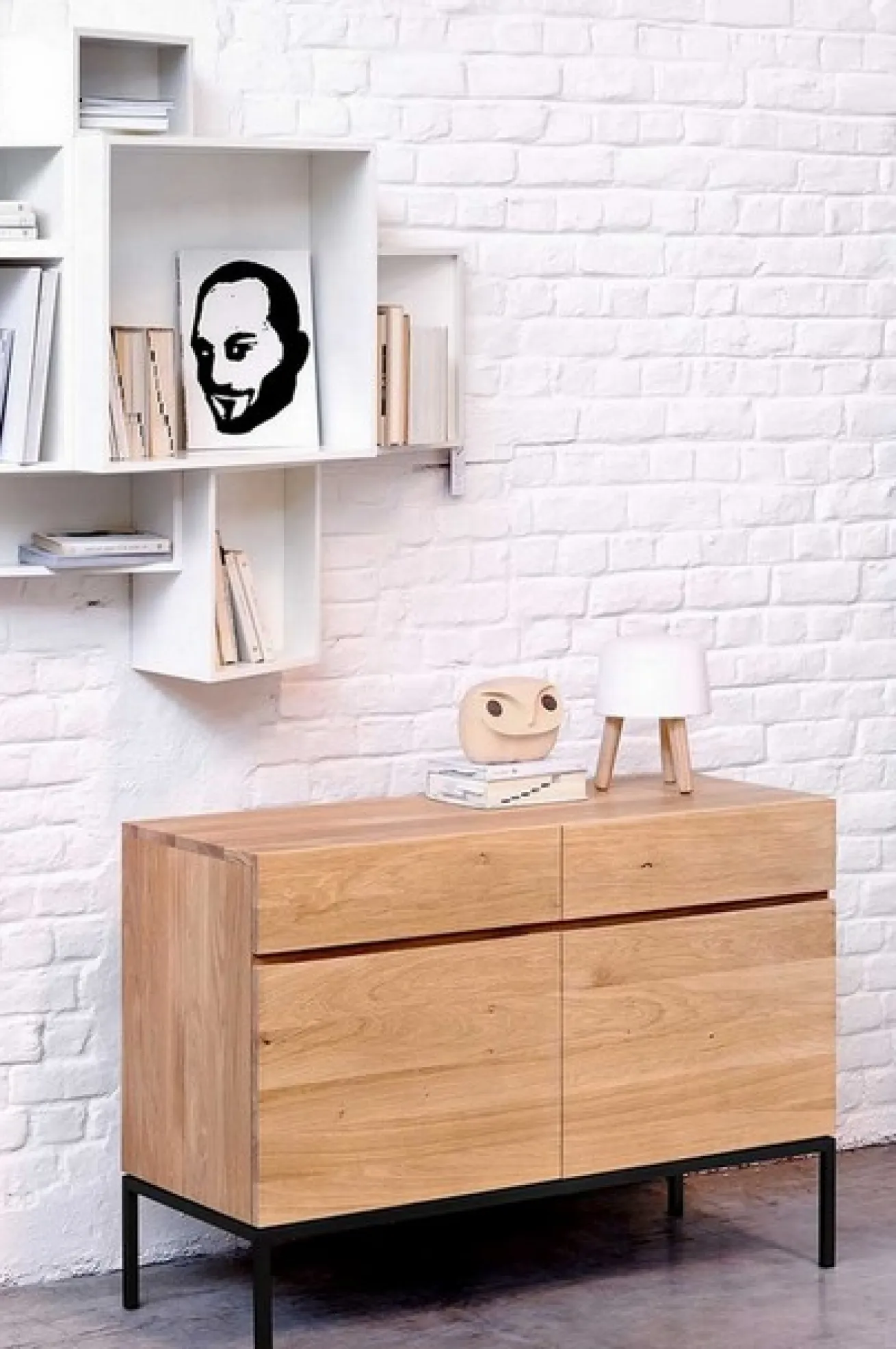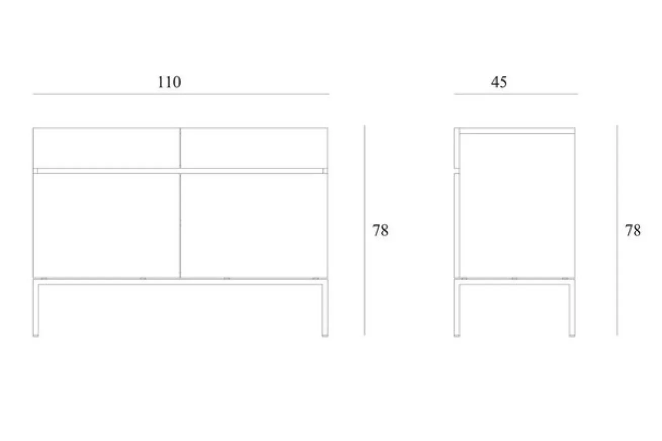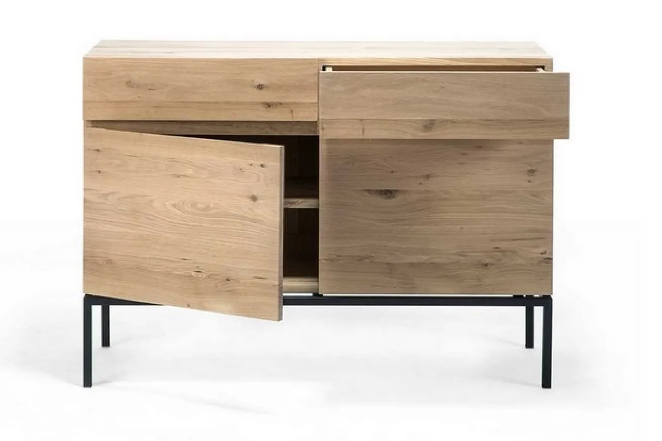 Die Kommode ist aus massivem Eichenholz und hat eine Breite von 110cm, eine Höhe von 78cm und eine Tiefe von 45cm. Sie hat zwei Schranktüren, die sich ohne Griff öffnen lassen. Das Innenleben dieser ist durch einen Einlegeboden aufgeteilt, wodurch sich der Stauraum unterschiedlich verwenden lässt. Über den Türen befinden sich zusätzlich zwei Schubladen, die für extra Verstauungsmöglichkeiten sorgen. Das Möbelstück sticht durch seine natürliche Farbe mit gleichmäßiger Maserung heraus. Das Ligna Sideboard hat aufgrund seiner schwarzen Edelstahlbeine eine sehr cleane Ausstrahlung. Es bietet perfekte Aufbewahrungsmöglichkeiten für Küche, Wohnzimmer oder Esszimmer.