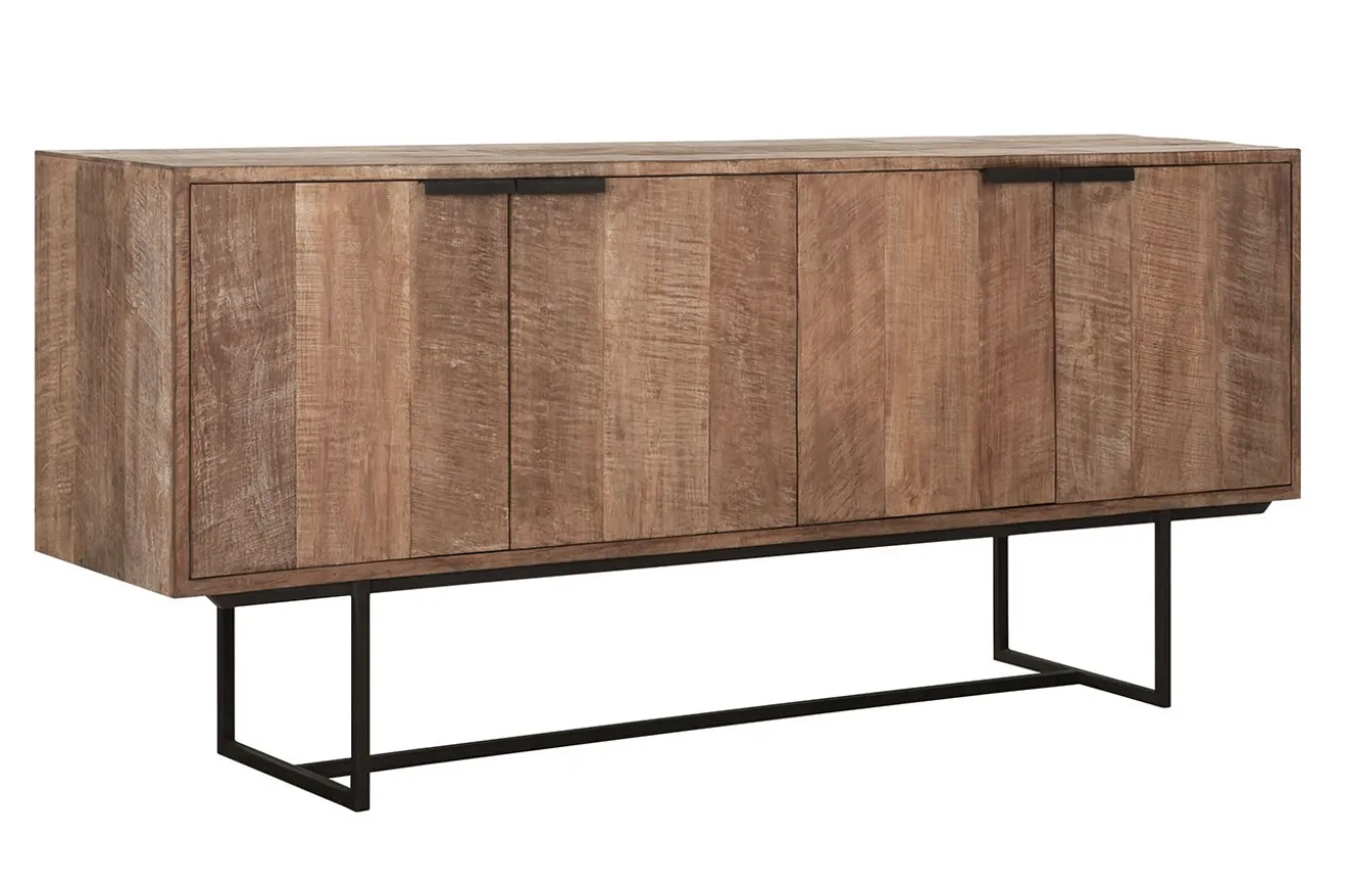 Das filigrane Metallgestell in Schwarz bildet einen faszinierenden Kontrast zur organischen Struktur des Holzkorpus. Es verleiht der Anrichte einen modernen Touch und sorgt gleichzeitig für Stabilität und Langlebigkeit. Dank der erhöhten Positionierung auf dem Gestell wirkt die Anrichte luftig und leicht, was Ihren Wohnraum optisch vergrößert und eine einladende Atmosphäre schafft.