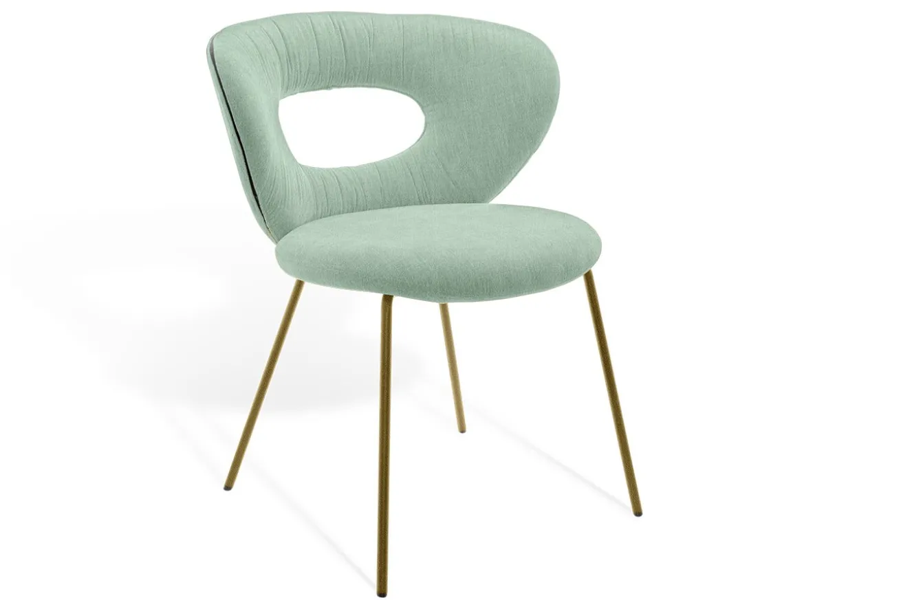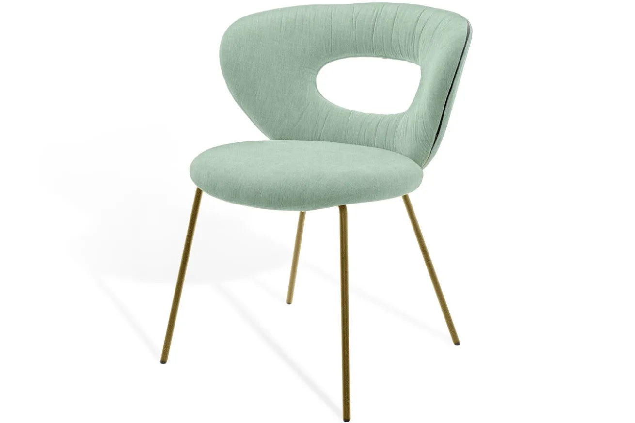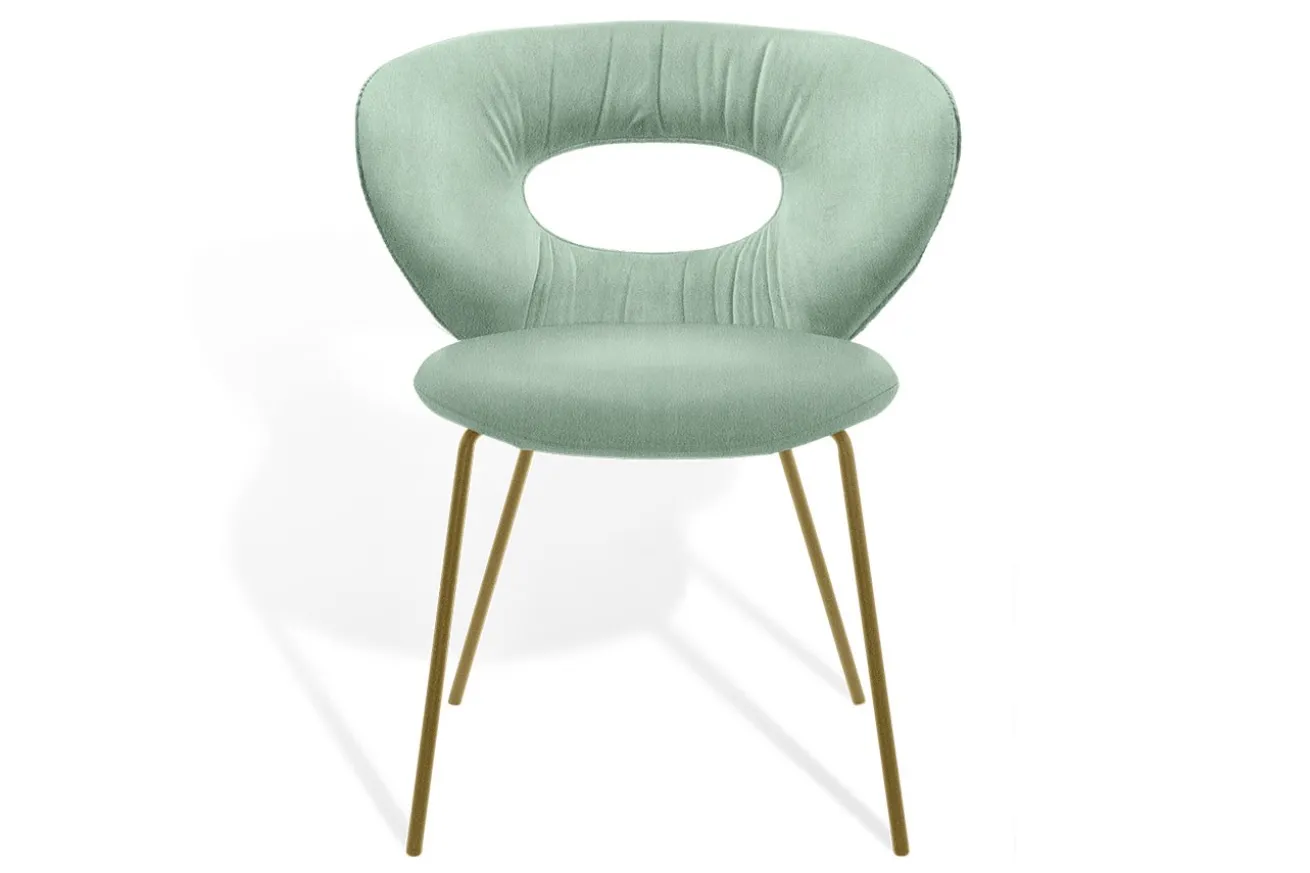Dieser einzigartige Stuhl kombiniert modernen Komfort mit einem auffälligen Design, das in jedem Raum sofort ins Auge sticht. Die geschwungene Rückenlehne mit ihrer charakteristischen Aussparung sorgt nicht nur für ein stilvolles Erscheinungsbild, sondern bietet auch angenehmen Halt und fördert eine entspannte Sitzposition. Der samtweiche Stoffbezug in zartem Mintgrün verleiht dem Stuhl eine frische, leichte Note und lädt zum Verweilen ein.