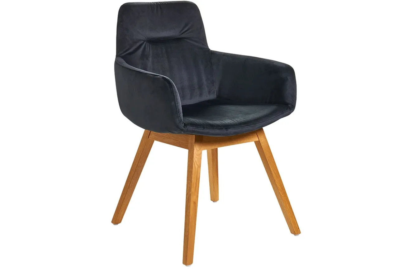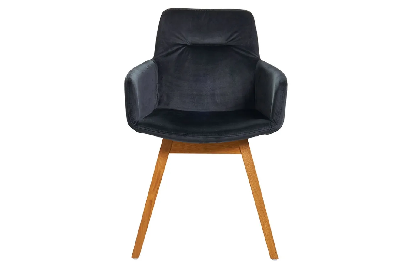 Die Holzfüße in natürlicher Farbe setzen nicht nur einen warmen Akzent, sondern unterstreichen auch die hochwertige Verarbeitung des Stuhls. Die klare Linienführung und die geschwungenen Armlehnen verleihen dem Möbelstück eine zeitgemäße Note, während die Holzfüße für Stabilität und einen Hauch von Natürlichkeit sorgen.