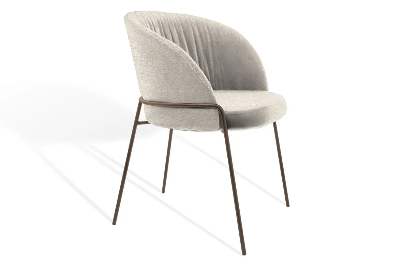 Das filigrane, bronzefarbene Metallgestell mit seinen schlanken Kufenbeinen trägt die weiche Polsterung und sorgt für Stabilität, ohne dabei die Leichtigkeit des Designs zu beeinträchtigen. Die Armlehnen sind dezent in das Gestell integriert und bieten eine angenehme Unterstützung, ohne den minimalistisch-eleganten Look zu stören.