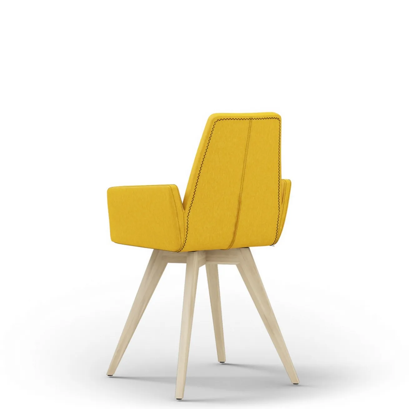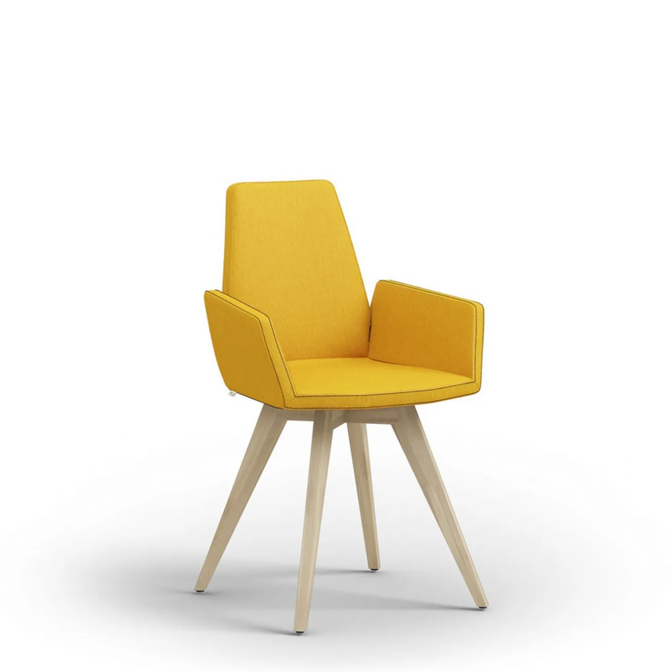 Darf es auch etwas Außergewöhnliches sein? Wie wäre es mit unserem Modell „Match 43“ mit einem gelben Stoffbezug und violetter Kontrastnaht? Unser Stuhl zeichnet sich nicht durch sein 0815-Aussehen aus, sondern durch seine besondere Form. Denn die Lehne ist nicht quadratisch oder rechteckig, sondern direkt sechseckig geförmt und lässt den Küchenstuhl zu einem absoluten Hingucker werden. Außerdem hat er zwei Armlehnen, die genauso eckig und besonders sind wie die restliche Aufmachung des Möbelstücks zum Sitzen. Der Stuhl hat die Maße Breite 52cm, Höhe 86cm und Tiefe 54cm. Getragen wird der gepolsterte Korpus des Esstischstuhls von vier mattlackierten und trotzdem naturfarbenen Beinen aus dem Massivholz Eiche, einem sehr harten und widerstandsfähigen Holz, das perfekt für lange haltbare Stühle geeignet ist. Egal, ob als Esszimmertisch in modern eingerichteten Milieus oder am Schreibtisch im Landhausstil – wir haben das perfect Match für Sie!