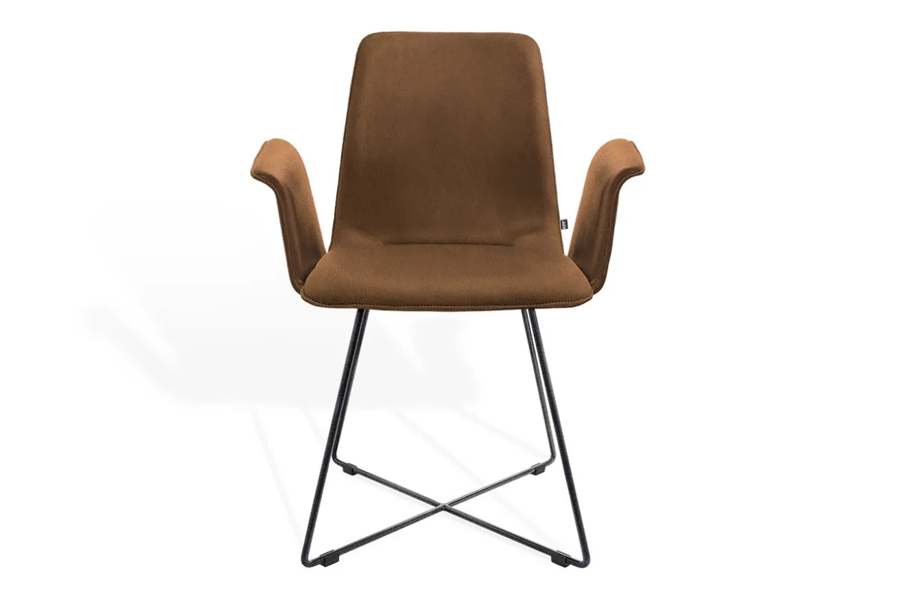 Dieser Armlehnstuhl vereint modernes Design mit einer Leichtigkeit, die in jedem Raum Akzente setzt. Der elegante Sitz, bezogen mit einem stilvollen, braunen Leder, bringt Wärme und Charakter in Ihre Einrichtung. Die markant geformten Armlehnen sorgen nicht nur für zusätzlichen Komfort, sondern verleihen dem Stuhl auch eine ausdrucksstarke Silhouette.