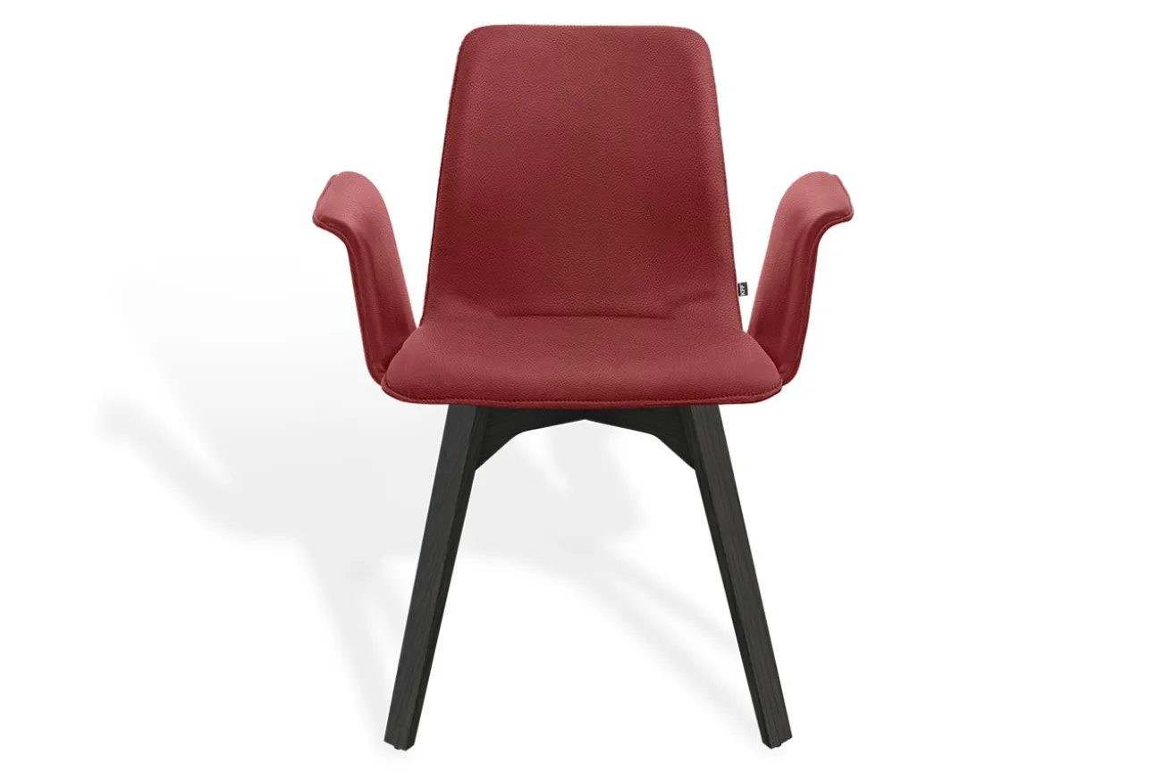 Dieser Armlehnstuhl vereint stilvolle Eleganz und zeitlosen Komfort. Mit seinem weichen Leder-Rost-Bezug strahlt er eine warme, einladende Atmosphäre aus, die sich in jedem Raum mühelos integrieren lässt. Die geschwungenen Armlehnen sorgen nicht nur für eine bequeme Sitzhaltung, sondern setzen auch ein modernes Designstatement.