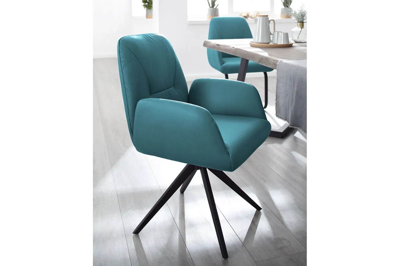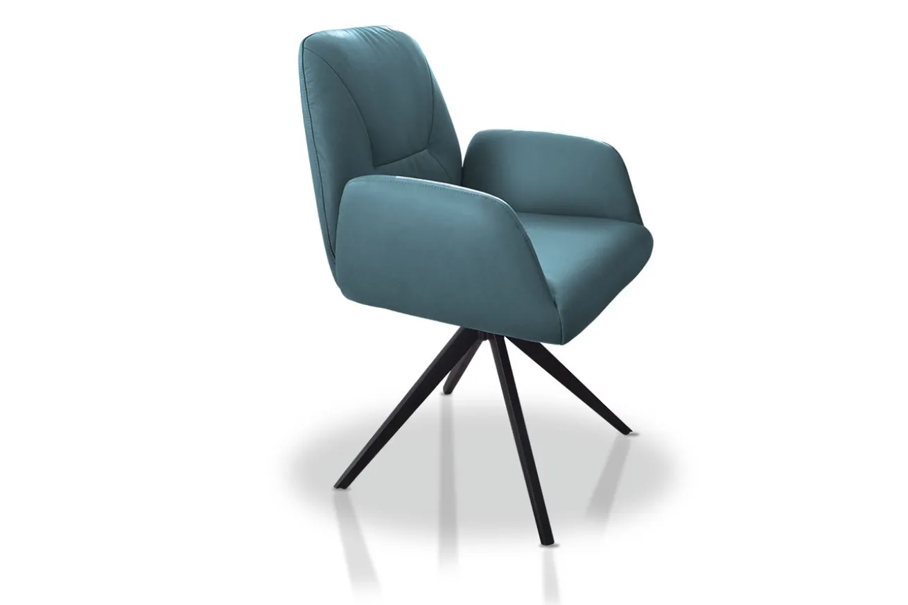 Der Stuhl begeistert nicht nur durch den legeren Lederbezug in Petrol, sondern auch durch die abgerundeten, ja fast freistehenden Armlehnen, die Ole zum schönen Möbelstück zum Sitzen machen. Dank einer ausgezeichneten Verarbeitung und vollständigen Polsterung sitzt es sich auf Ole sehr bequem. Der kräftige Petrolton des hochwertigen Leders betont nicht nur die Qualität des Materials, sondern lässt den Stuhl in einem luxuriösen Licht erscheinen. Dafür sorgt außerdem das Gestell, das moderne Eleganz ausstrahlt. Dank der Drehfunktion können Sie viel leichter vom Tisch aufstehen, indem Sie sich von diesem vor dem Erheben wegdrehen. Der integrierte Rückholmechanismus lässt Ole wieder in seine Ausgangsposition zurückversetzen. Er ist ein Esszimmerstuhl, der in jedem Wohnstil für einen knalligen Farbtupfer sorgt.