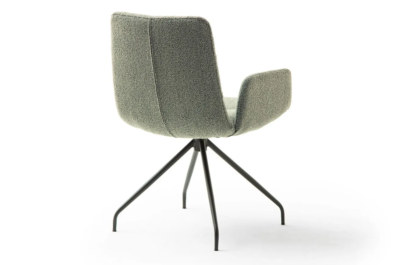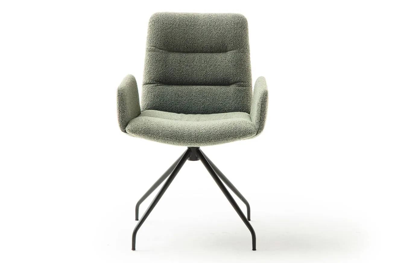 Das mattschwarze Metallgestell bildet nicht nur einen markanten Kontrast zum lebhaften Grün, sondern verleiht dem Stuhl auch eine moderne Note. Die geschwungene Form der Armlehnen und das drehbare Design tragen zur Funktionalität bei, während das stabile Metallgestell eine robuste Basis für den Sitzkomfort bildet.