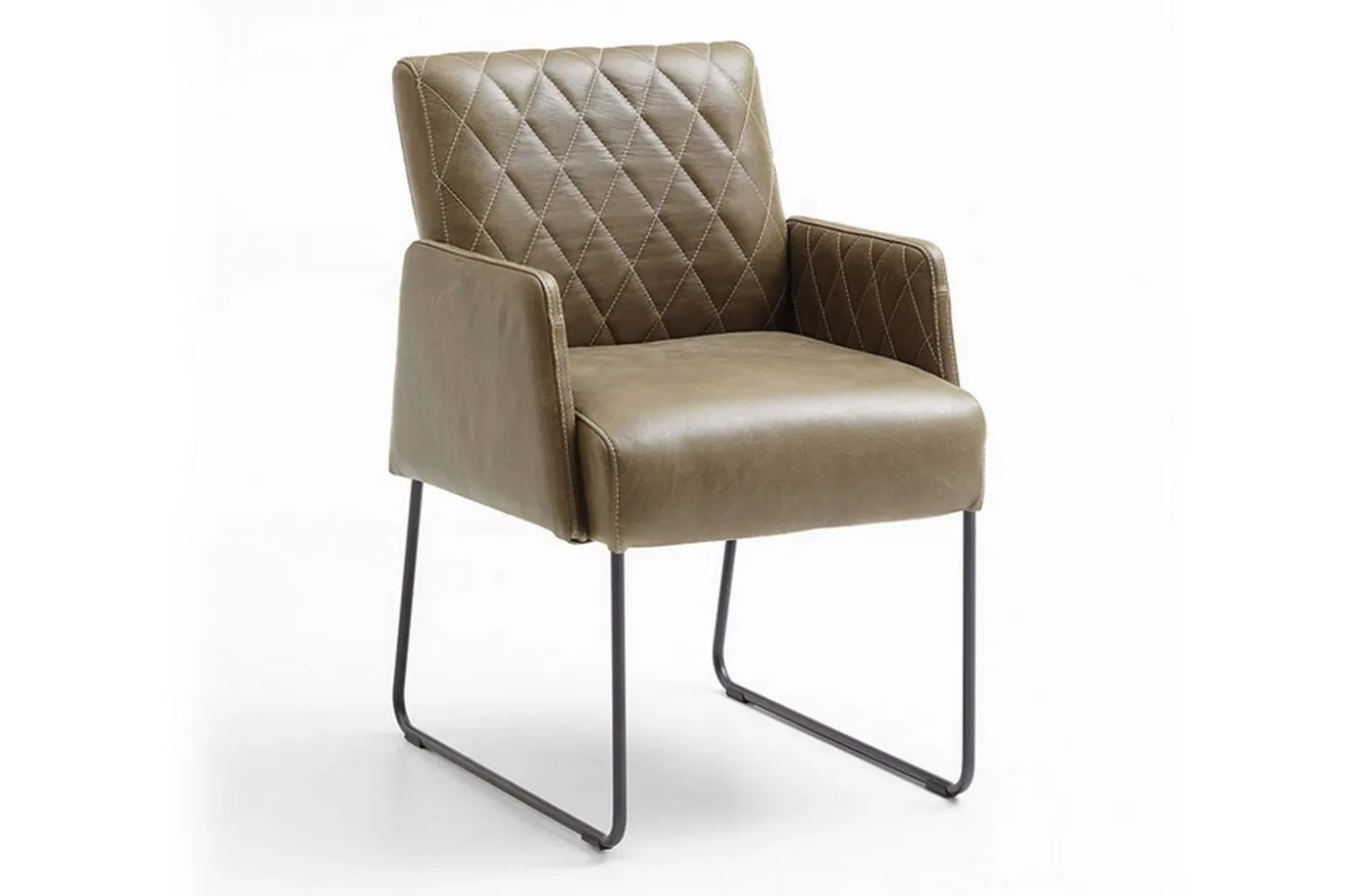 Manchmal möchte man einen gemütlichen Schreibtischstuhl, der nicht aussieht wie die gewöhnlichen Stühle, sondern einen mit besonderem Look. Deshalb haben wir hier diesen Armlehnstuhl Sea aus grünem Leder für Sie! Das gepolsterte Möbelstück hat die Maße Breite 61cm, Höhe 91cm und Tiefe 67cm. Die Innenseite der Lehne ist gesteppt und sorgt so für einen eleganten Look. Der Korpus wird von zwei dunklen, filigranen Metallfüßen getragen. Durch die waldgrüne Colorierung des Leders, das sowohl reißfest als auch alterungsbeständig ist, in Kombination mit den Beinen strahlt der Stuhl ein klassiches Flair aus. So möchte man den Stuhl an einen dunklen Massivholztisch stellen, sei es Schreib- oder Esstisch. Nach getaner Arbeit können Sie Ihre Arme problemlos auf den Armlehnen ablegen und entspannen.