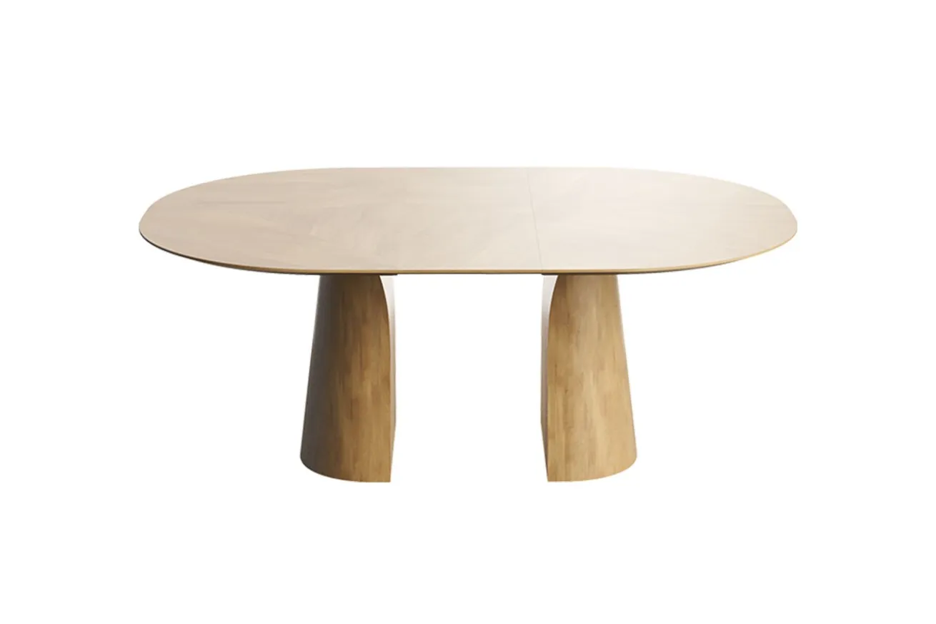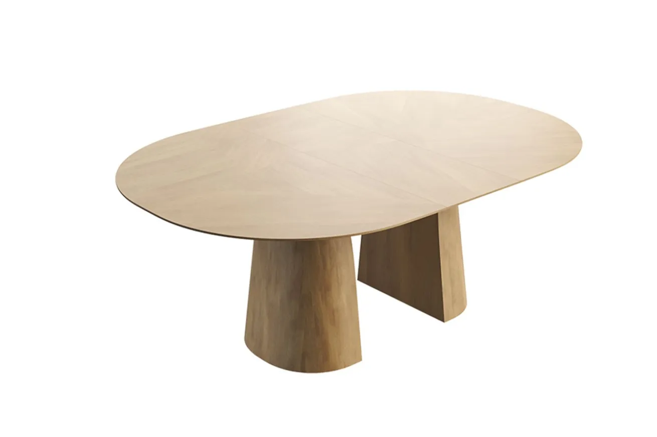 Dieser stilvolle Ausziehtisch vereint modernes Design und hohe Funktionalität in Perfektion. Mit seiner eleganten ovalen Tischplatte und den markanten, skulpturalen Beinen aus hochwertigem Holz wird er zum Highlight in jedem Essbereich. Die natürliche Holzmaserung unterstreicht den warmen, einladenden Charakter dieses Möbelstücks und verleiht ihm eine zeitlose Eleganz. Dank der cleveren Ausziehfunktion lässt sich der Tisch mühelos erweitern und bietet so Platz für spontane Gäste oder größere Familienessen. Im kompakten Zustand eignet er sich ideal für den Alltag, während die erweiterte Tischplatte genügend Raum für gesellige Abende oder Feierlichkeiten bietet. Die robusten Tischbeine sorgen nicht nur für Stabilität, sondern setzen mit ihrer einzigartigen Form ein modernes Design-Statement. Gefertigt aus sorgfältig ausgewählten Materialien, verspricht dieser Ausziehtisch Langlebigkeit und Belastbarkeit. Ob als Esszimmertisch, Konferenztisch oder dekoratives Highlight in Ihrem Zuhause – er überzeugt in jeder Hinsicht. Dieser Tisch fügt sich nahtlos in verschiedene Wohnstile ein – von minimalistisch-modern bis hin zu klassisch-natürlich. Seine klare Formensprache und die hochwertige Verarbeitung machen ihn zu einem Möbelstück, das nicht nur praktisch, sondern auch ästhetisch ansprechend ist.