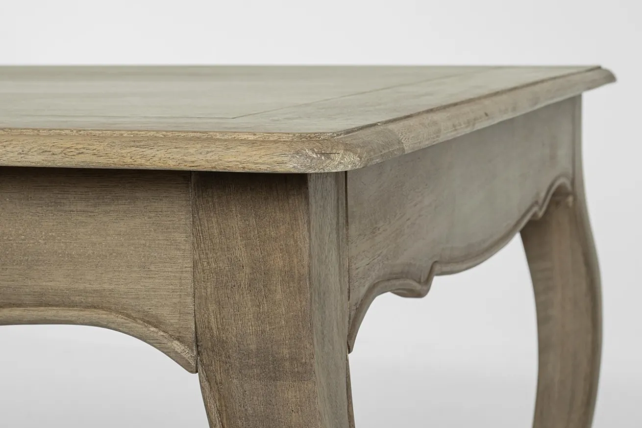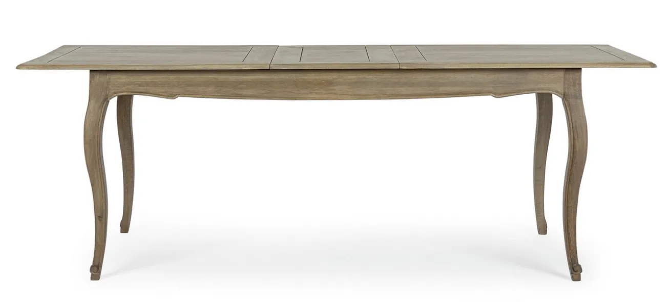 Der dem Barockstil anmutenden Tisch fehlt es an nichts: Er besteht, wie es sich für einen stabilen und lange haltbaren Esstisch gehört, aus massivem Mangoholz in Naturfarbe mit durchsichtig lackierter Oberfläche. Diese Holzart findet sich vor allem heute in der modernen Inneneinrichtung wieder, auch wenn die geschwungene Tischzarge und die leicht Barock anmutenden Beine auf den Vintage-Stil hinweisen. Der rechteckige Tisch bietet Platz für das fürstliche Paar, das morgens zusammen speist. Kündigt sich hoher Besuch an, lässt sich Domo ganz einfach mit einer zusätzlichen Platte ausziehen, so dass aus einem Tisch eine Tafel wird, an der jeder seinen Platz findet.