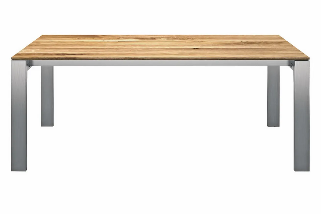 Der ausziehbare Esstisch Venus besticht durch seine natürliche Farbe und vor allem durch seine Beine aus Edelstahl. Die Tischplatte aus naturfarbenen Asteiche, die durch ihre stark ausgeprägten Wuchsmerkmale wie Jahresringe überzeugt, wurde durchsichtig geölt, um die Naturfarbe und die von Natur gegebenen Details wie Harzkanäle zu schützen. Auf dem hochwertigen und langlebigen Möbelstück dürfen Sie durchaus die Puppen tanzen lassen.