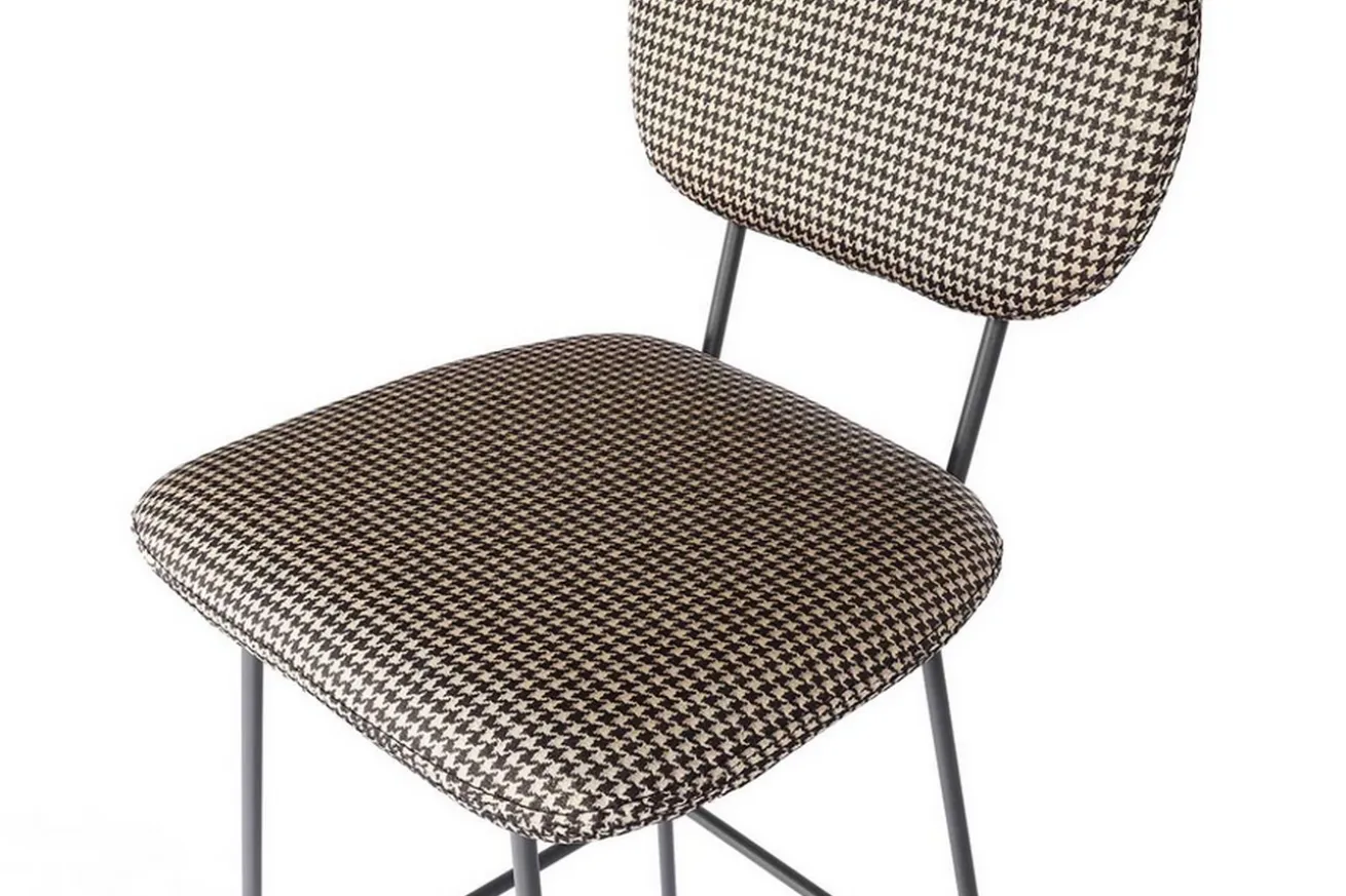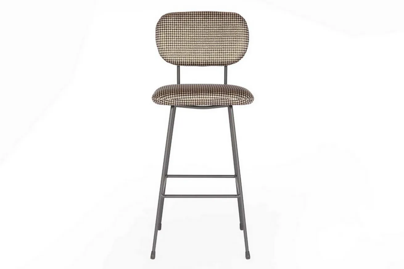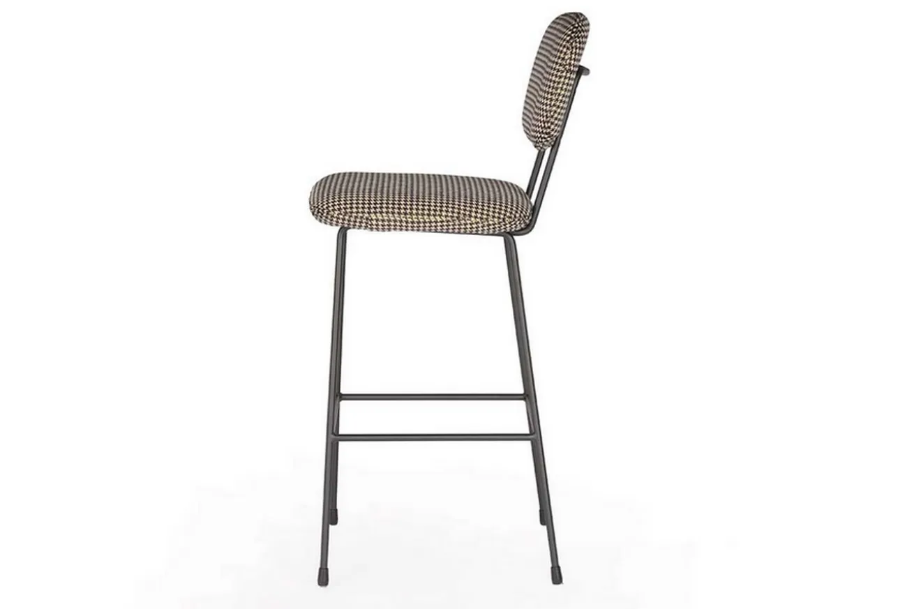 Der Barhocker im neuen Look wirkt durch die Trennung von Sitzfläche und Rückenlehne optisch sehr viel leichter als die klassischen Modelle. Er hat die Maße Breite 48cm, Höhe 110cm und Tiefe 58cm. Drei Gründe, die für dieses Produkt sprechen, sind einmal die originelle Verbindung aus Stoff und Stahl, dann der außergewöhnliche Look und zu guter Letzt der schicke Bezug. Sitz- und Lehnfläche bestehen nämlich aus Stoff in kariertem schwarz und weißen Hahnentrittmuster, die auf einem Gestell aus schwarzem Stahlgestell befestigt sind. Die dunkle Farbe des Stahls in Kombination mit der hellen Stoffarbe ist dieser Barstuhl ein außergewöhnliches Objekt, das aber in eben dieser Kombination einfach nur klasse aussieht! Der Stuhl eignet sich somit nicht nur in modernen Milieus, sondern auch in klassisch-rustikalen Einrichtungen mit dunklen Massivholzmöbeln.