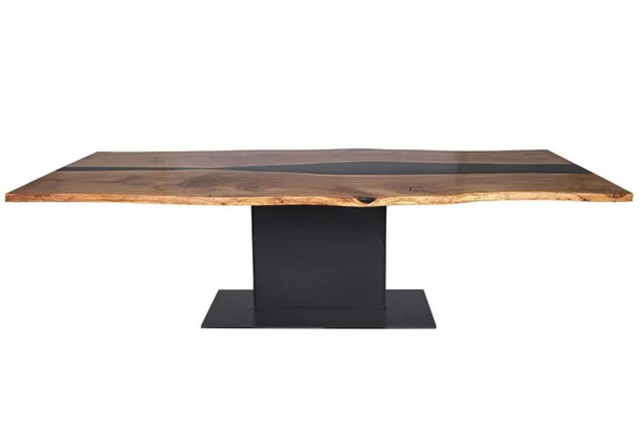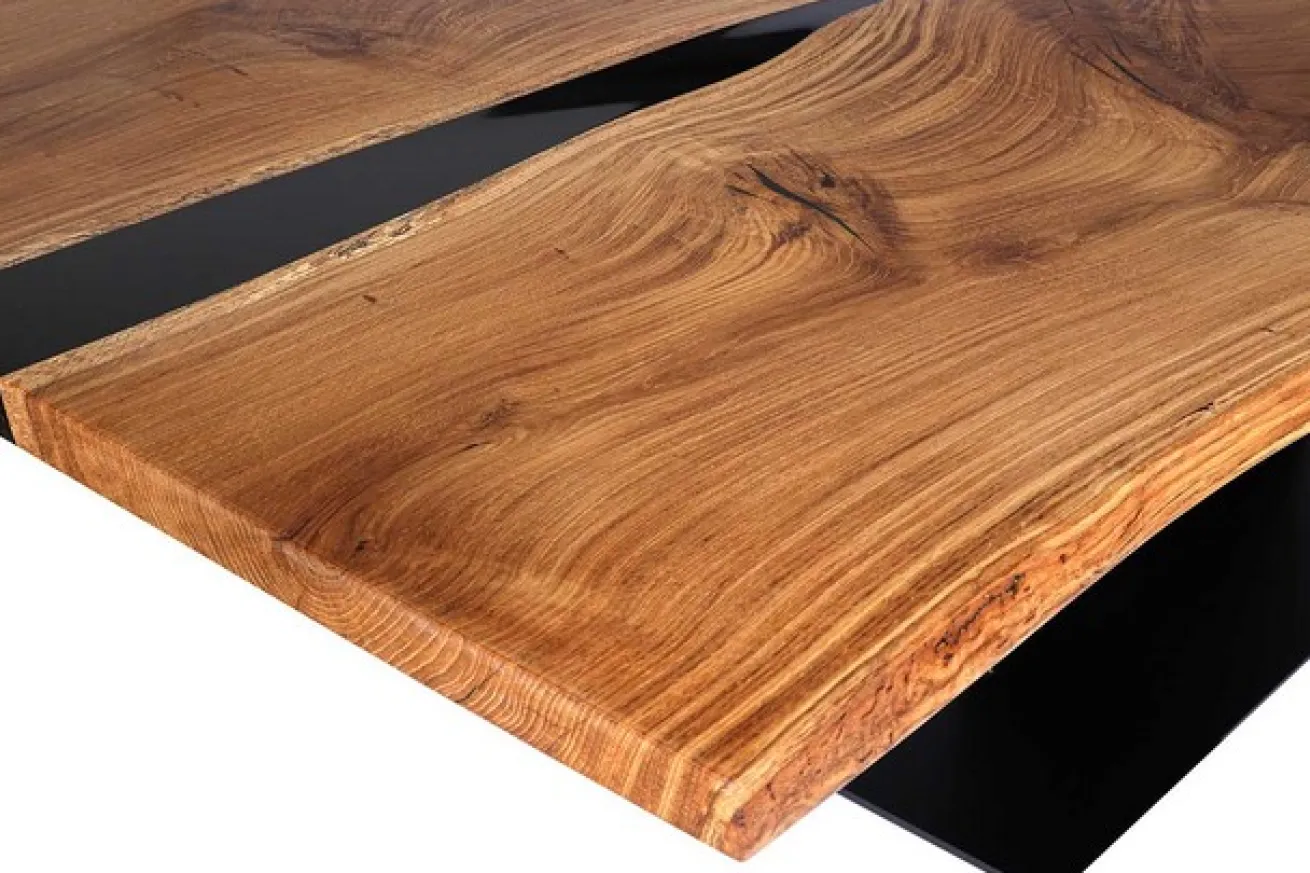 Dieser einzigartige Tisch ist ein wahrer Hingucker in modern eingerichteten Wohnungen und Häuern. Nicht umsonst heißt er „Butterfly“. Diese Tischplatte besteht zwar aus zwei einzelnen Platten, aber nicht aus Planken, sondern aus zwei Scheiben, die in der Mitte mit schwarzem Epoxy zusammengehalten werden. Dadurch erhält dieses Holzprodukt ein sehr unikates Design, denn so einen Tisch erhält man nicht alle Tage. Die Platte ist von einer mitteldunklen Maserung durchzogen. Im Allgemeinen sind Jahresringe, Harzkanaäle und Holzstrahlen dieser Baumart sehr gut zu erkennen. Die natürlich-warme Farbgebug steht einerseits im Zusammenspiel, andererseits auch irgendwie im Kontrast zum dunklen Epoxy sowie dem Tischgestell aus schwarzem Rohstahl. Die Oberfläche wurde geölt, wodurch das Eichenholz dunkler erscheint. Durch die organische Kante der großen Platte wird das Massivholzmöbel noch deutlicher zu einem besonderen Produkt. Es hat die Maße Breite 280cm, Höhe 78cm und Tiefe 105-122cm. Der Tisch eignet sich super als Esstisch.