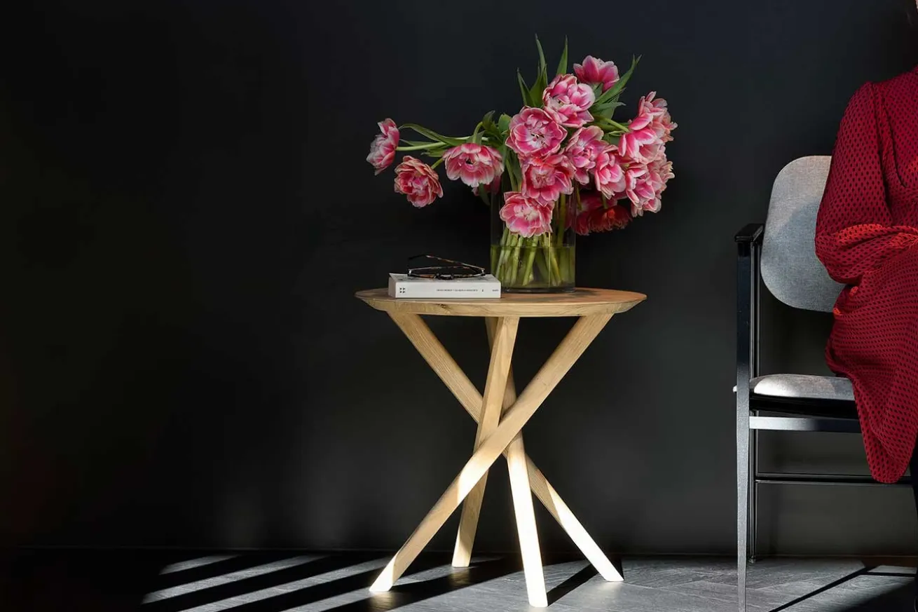 Wie Ess- und Gartentische zeichnet sich auch der Beisteller Mikado durch seine an das gleichnamige Spiel mit Stäben aus, da die Füße unregelmäßig angeordnet sind und sich in der Mitte treffen. Der Beistelltisch besteht komplett aus massivem Eichenholz und strahlt in seiner natürlich-warmen Farbe, wobei die Oberfläche zum Schutz durchsichtig lackiert wurde. Mit einem Durchmesser und einer Höhe von je 50cm eignet sich Mikado als Beisteller neben dem Sofa im Wohnzimmer, als Nachttisch im Schlafzimmer oder in leeren Ecken als Platzhalter, auf dem Sie dann eine üppig gefüllte Vase stellen.