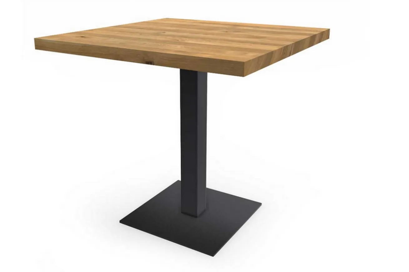 Dieser Bistrotisch ist aus massiver europäischer Eiche gefertigt und hat eine optische Plattenstärke von 4 cm. Die Oberfläche ist geschliffen. Die Äste und Risse sind offen und nicht manuell behandelt sondern im natürlichen Rohzustand. Die gesamte Oberfläche ist noch unbehandelt. Durch die unbehandelte Oberfläche können Sie eine Oberflächenversieglung oder Farbe je nach Geschmack selber auftragen. Üblicherweise wird die Holzgüteklasse B für den Plattenbau verwendet. Die Planken sind zwischen 8-18cm breit. Somit erhalten Sie einen einen quadratischen Bistrotisch mit einer Breite und Tiefe von je 50cm. Die unbehandelte Eicheplatte wird von einem schwarz pulverbeschichteten Stahlgestell getragen und verleiht dem Möbelstück somit eine Höhe von 76 cm.