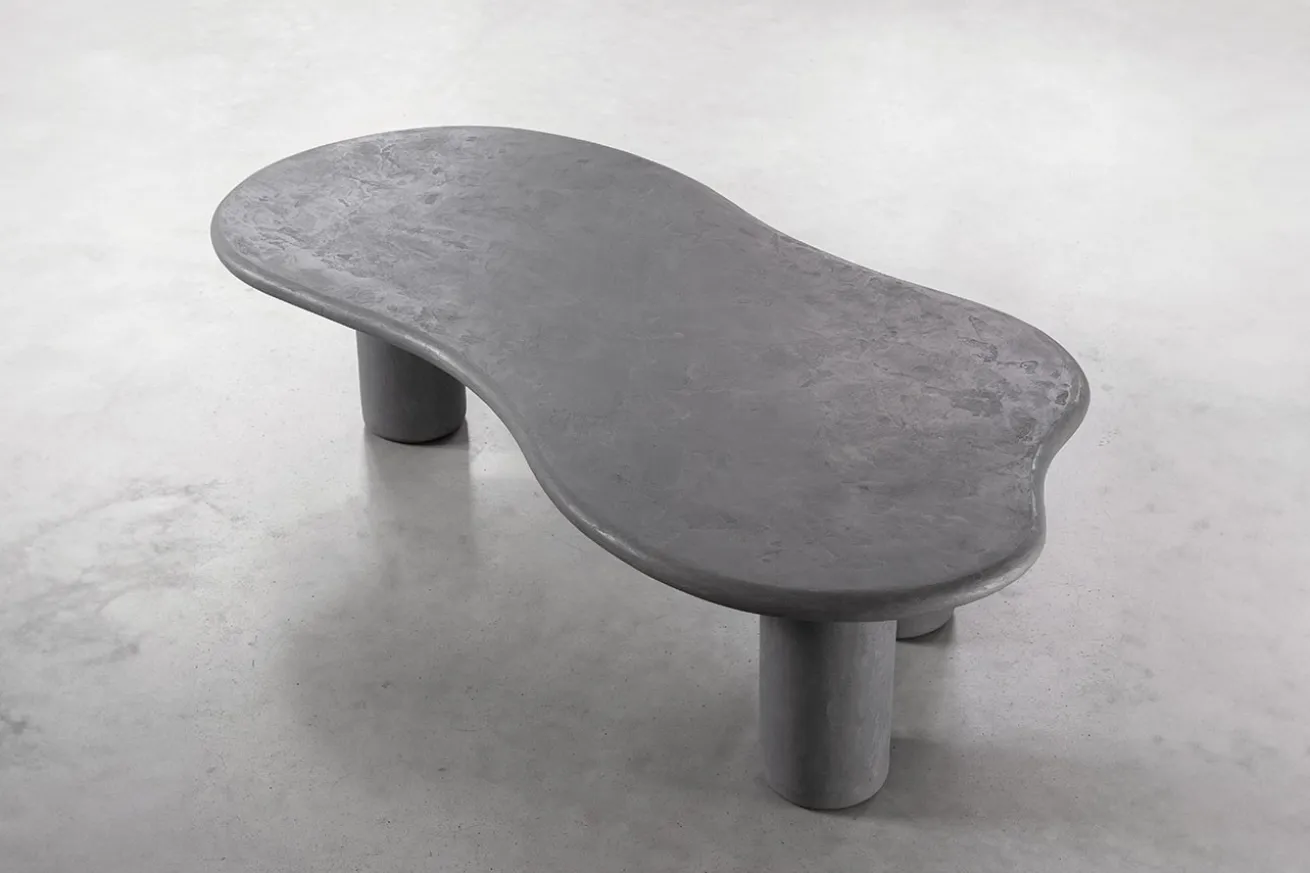 Die Platte des Tisches wurde kurvenförmig kreiert, was ihm eine einzigartige Ästhetik verleiht. Diese geschwungene Formgebung schafft eine dynamische Silhouette und verleiht dem Tisch eine luftige Leichtigkeit, die jeden Raum bereichert. Die graue Farbgebung des Mortex sorgt für eine moderne und dennoch zeitlose Ausstrahlung, die sich nahtlos in jedes Wohnkonzept einfügt.