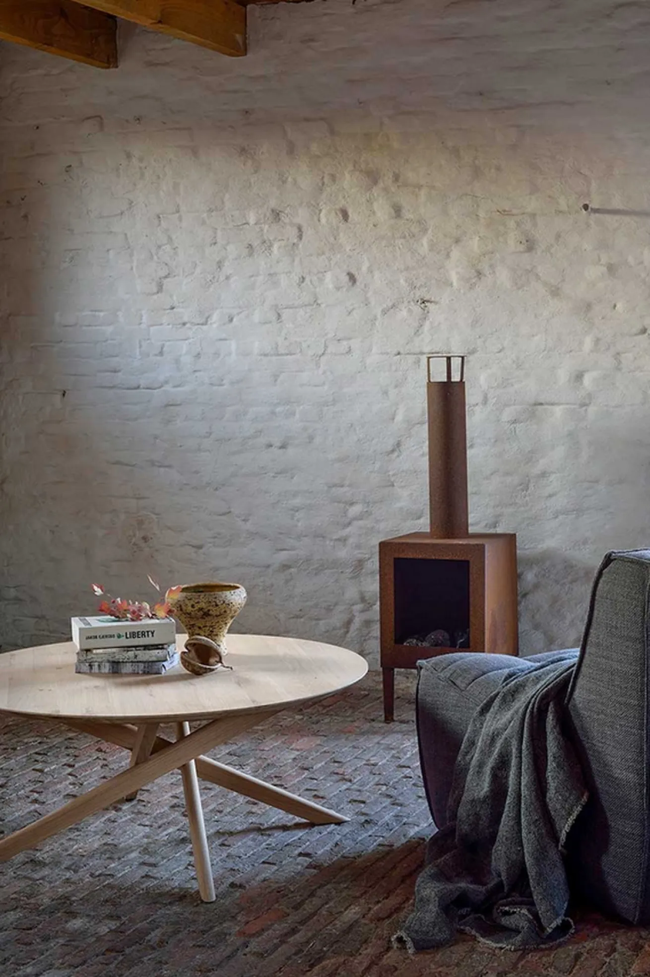 Der Couchtisch ist aus dem Massivholz Eiche gefertigt, das nicht nur im Hausbau bei Treppen sehr begehrt ist, sondern auch bei Tischen. Dieses Modell beispielsweise hat eine runde Form, dadurch einen Durchmesser von 100cm und eine Höhe von 42cm. Die Fläche wurde aus einzelnen, aneinandergepressten Holzbohlen zusammengesetzt und ergibt so eine Platte mit einer für Eichenholz typischen Masserung. Die Oberfläche wurde geölt. Das rustikal aussehende Massivholzmöbel steht auf asymmetrischen, unterschiedlich ausgerichteten Beinen aus dem gleichen Holz, wodurch das Möbelstück aussieht, als wäre es aus einem ganzen Stück kreiert worden. Dadurch erhält der Massivholztisch einen moderneren Look.