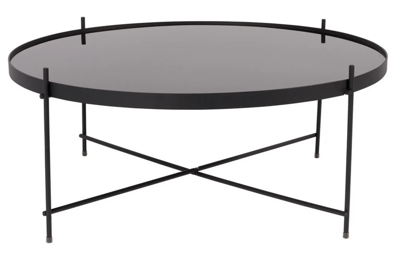 Dieser Couchtisch hat ein schwarzes Metallgestell. Die Ablagefläche aus Glas hat die gleiche Farbe. Durch die einheitliche Farbe und die glänzende Oberfläche wird diesem Beistelltisch ein moderner und edler Look verliehen. Eben dieser moderne und edle Look verleiht diesem Tisch nahezu grenzenlose Freiheit, was den Punkt Kombinationsmöglichkeiten betrifft, egal ob Wohnzimmer oder Flur! Er hat die Maße Höhe 35cm und einen Durchmesser von 82,5cm. Durch das klappbare Metallgestell lässt sich dieser Beisteller in runder Form auch gut verstauen wenn Sie ihn mal nicht benutzen! Er ist im modernen Stil gefertigt und passt in genau diese Milieus. Er lässt sich super mit anderen Produkten in schlichten Farben kombinieren.