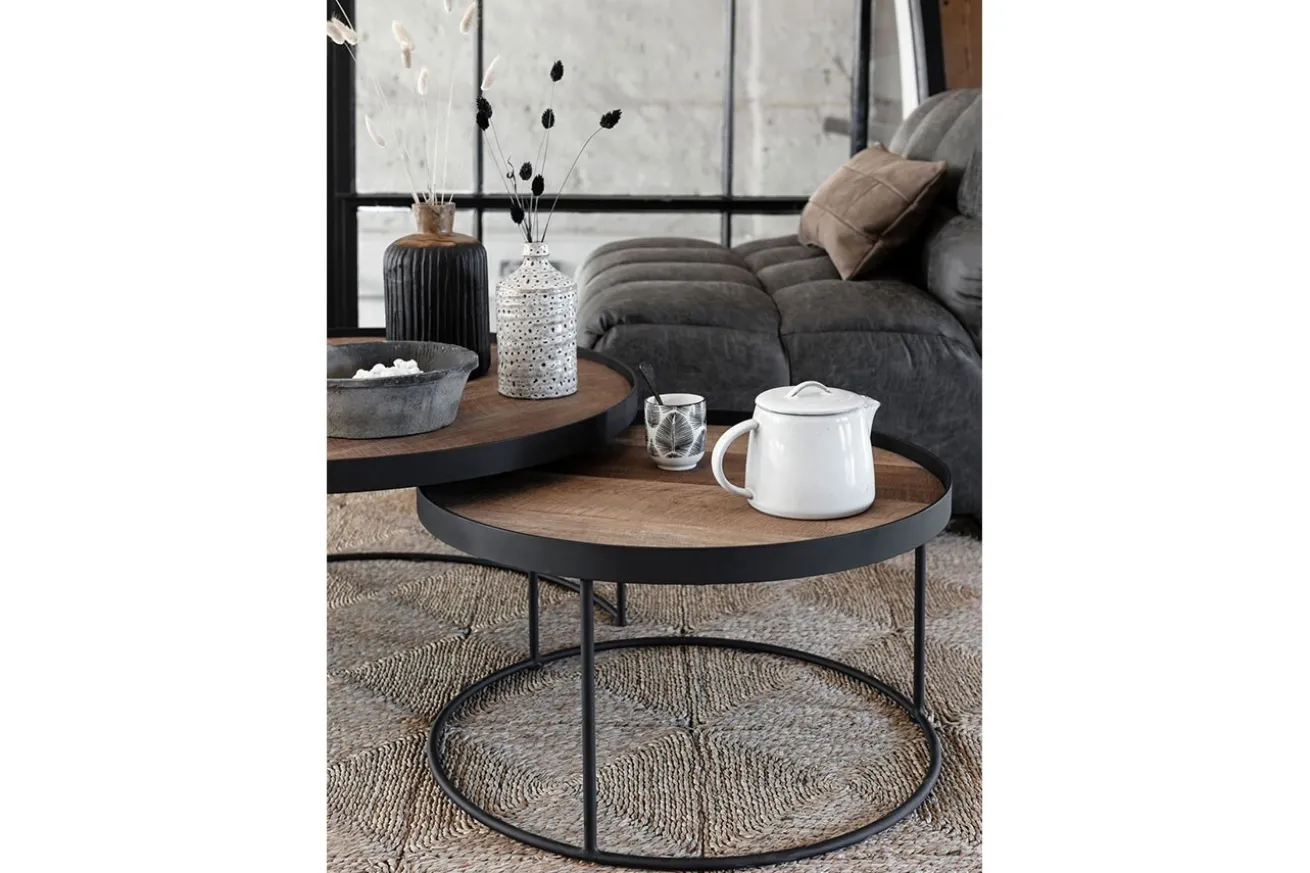 Das 2er Set bietet unterschiedliche Größen, die eine vielseitige Anordnung und Nutzungsmöglichkeiten schaffen. Die schwarzen Metallgestelle sind nicht nur solide Stützen, sondern auch ein Statement moderner Ästhetik. Sie bilden einen spannenden Kontrast zur Teakholzplatte und verleihen den Tischen einen zeitgenössischen Charakter.