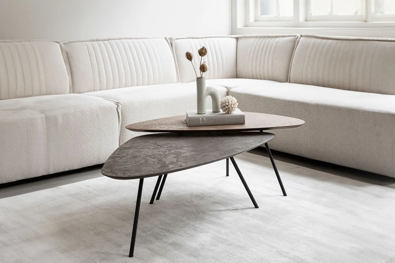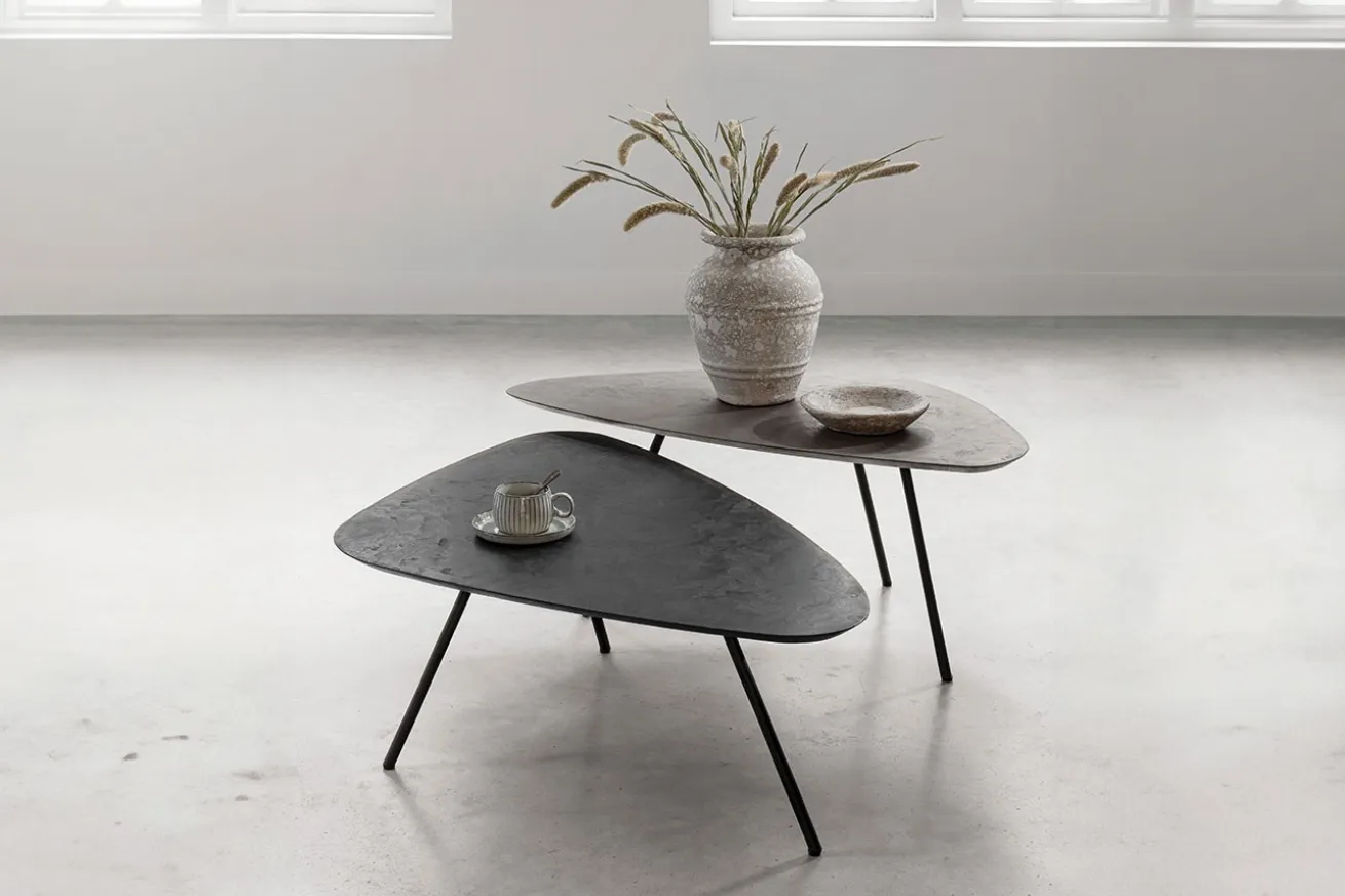 Die dreieckige Formgebung der Tische erzeugt eine dynamische und zugleich elegante Ästhetik, die jeden Raum bereichert. Getragen werden die Tische von jeweils drei filigranen Metallfüßen in Schwarz, die nicht nur für Stabilität sorgen, sondern auch einen kontrastreichen Akzent setzen und das moderne Design perfekt abrunden.
