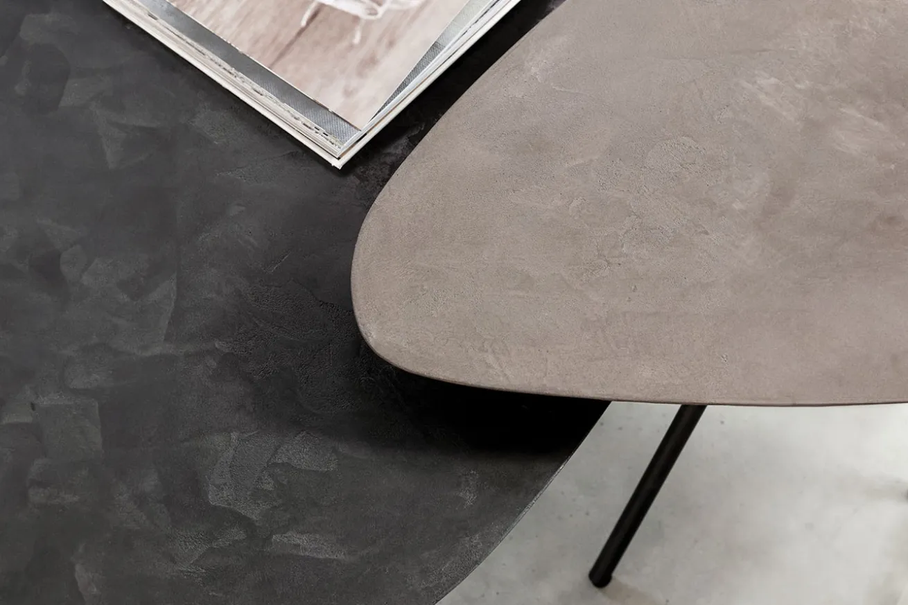 Jeder Tisch des Sets präsentiert eine einzigartige dreieckige Oberfläche aus Mortex, die in verschiedenen Schwarznuancen gehalten ist. Diese raffinierte Farbgebung verleiht den Tischen eine ansprechende Tiefe und einen Hauch von Mystik, während die filigrane Struktur des Mortex eine luxuriöse Haptik und ein modernes Erscheinungsbild bietet.