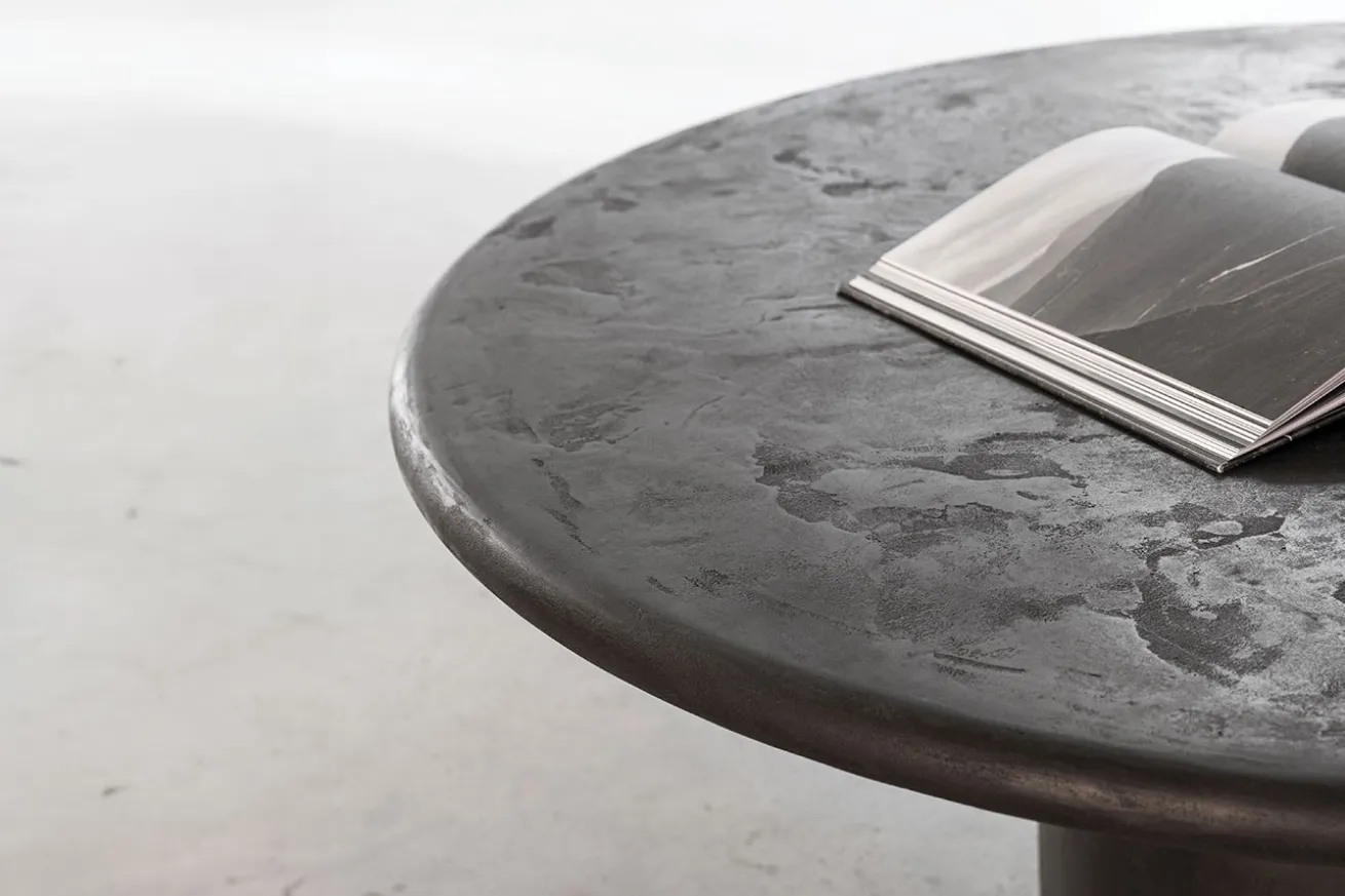 Der Tisch wird von einem runden Fuß in Schwarz aus Mortex getragen, der nicht nur für Stabilität sorgt, sondern auch einen markanten Akzent setzt. Die klare Linienführung und die schlichte Formgebung des Fußes unterstreichen das moderne Design des Tisches und machen ihn zu einem echten Statement für individuellen Stil und Geschmack.