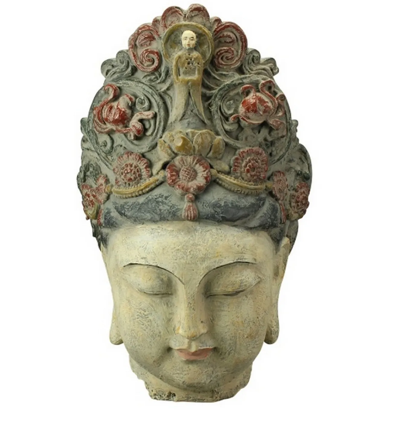 Bei diesem Kopf handelt es sich weder um einen Perückenkopf noch um eine Schaufensterpuppe, sondern um einen dekorativen Kopf in Anlehnung einer chinesischen Göttin. Die Büste aus Kunststoff wurde im Vintagestil gefertigt. Ein dekoratives Ornament ziert die aufwendig gearbeitete Frisur der Göttin, die Ruhe und Gelassenheit ausstrahlt. Sie ist 66cm hoch.