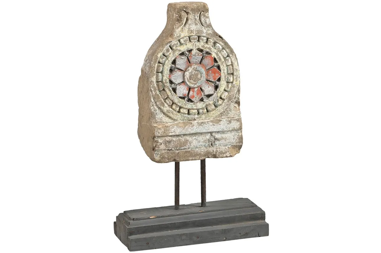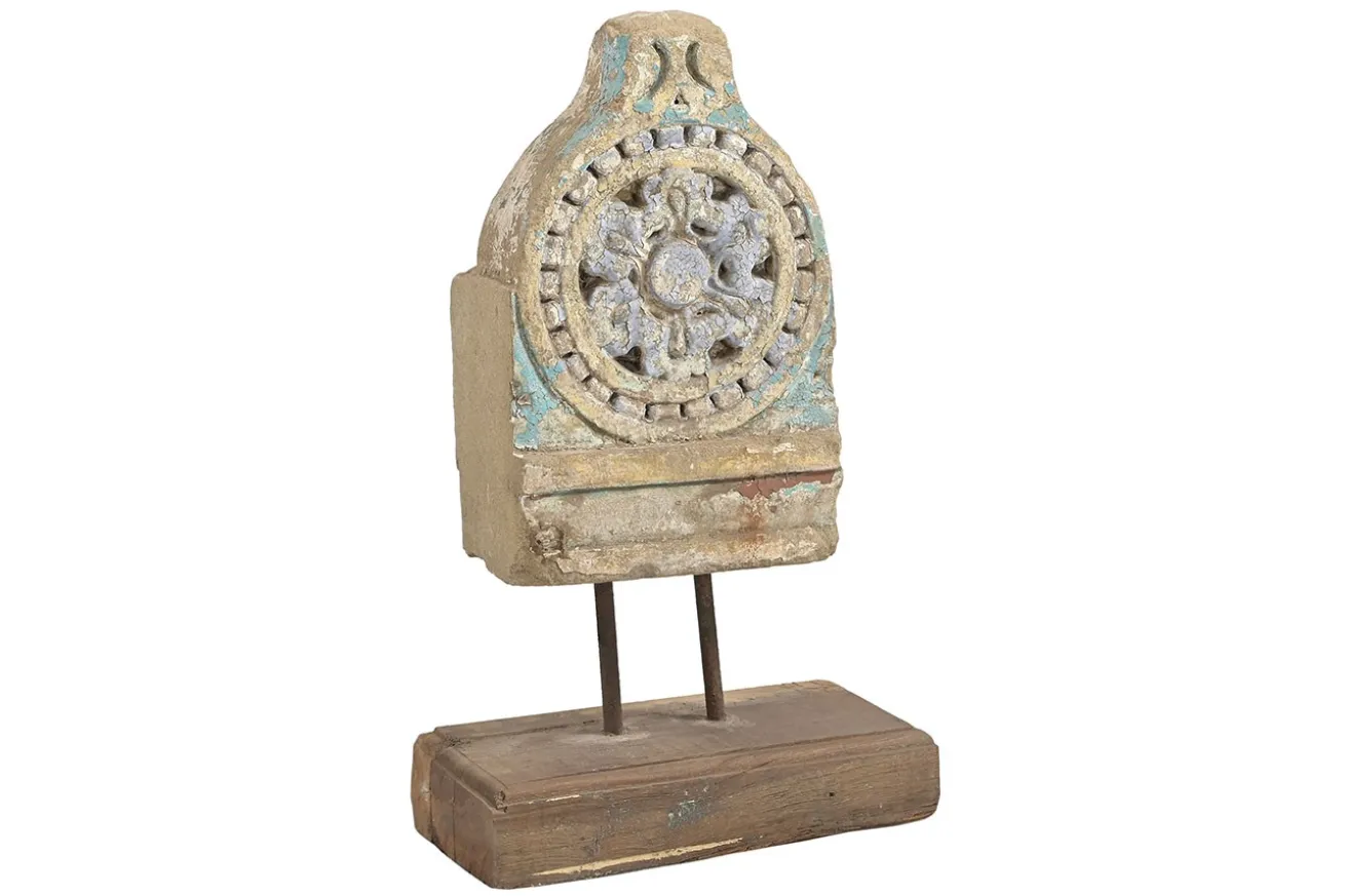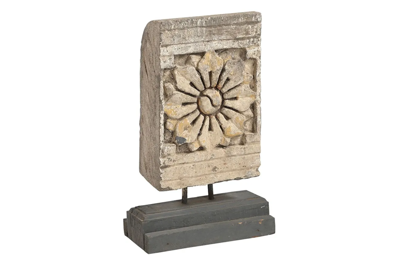 Florale Ornamente, Rosetten oder runde Reliefs: Diese dekorativen Objekte wurden aus alten Steinbauteilen herausgelöst und auf einfache Holzsockel montiert. Die Patina ist je nach Modell unterschiedlich – von naturbelassenem Stein bis zu Farbresten in Ocker oder Blaugrau.
