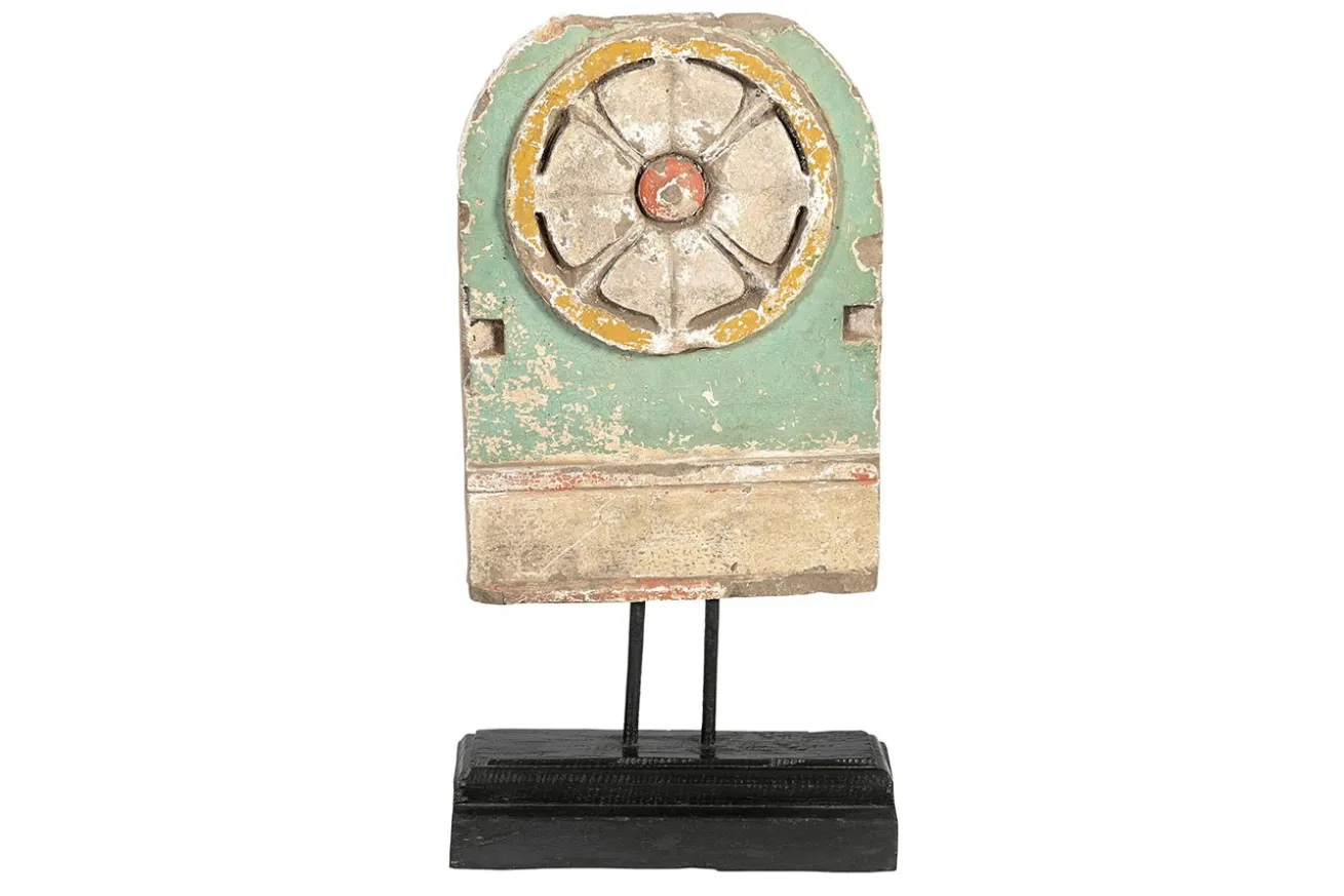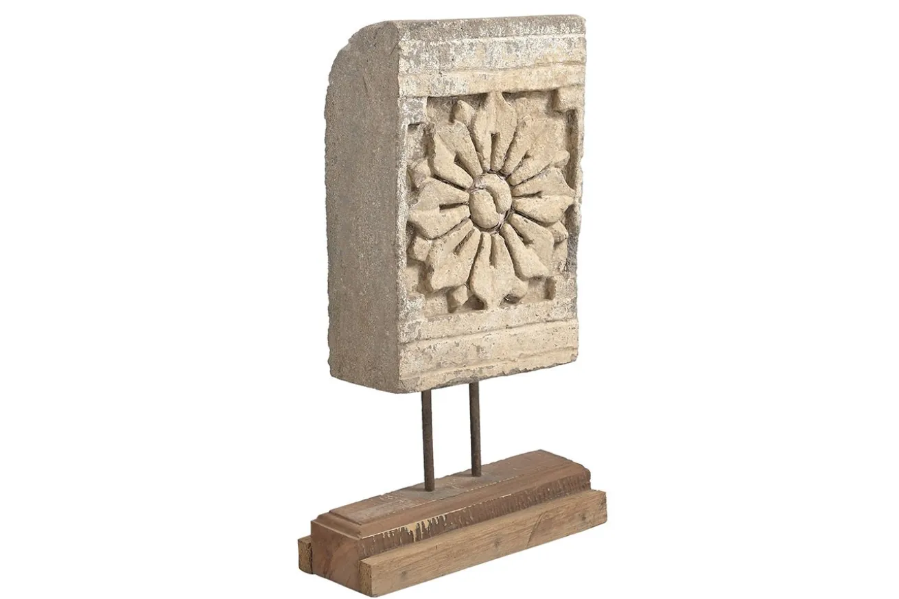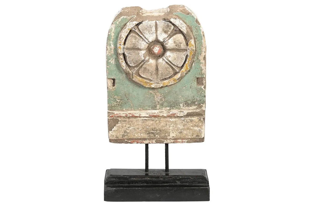 Florale Ornamente, Rosetten oder runde Reliefs: Diese dekorativen Objekte wurden aus alten Steinbauteilen herausgelöst und auf einfache Holzsockel montiert. Die Patina ist je nach Modell unterschiedlich – von naturbelassenem Stein bis zu Farbresten in Ocker oder Blaugrau.