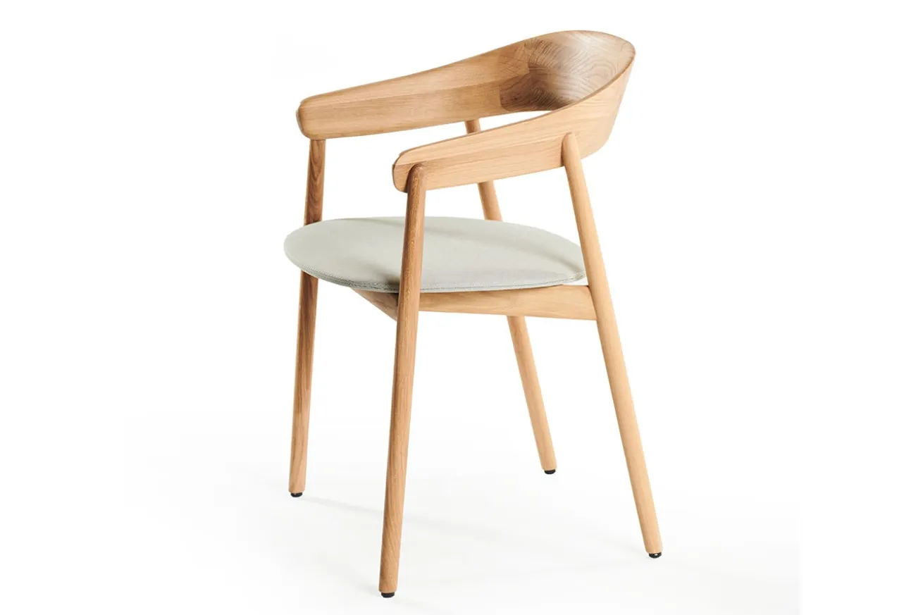 Unaj ist eine Einladung zum Sitzen. Die fließende Linie der Rücken- und Armlehne, das handwerklich präzise verarbeitete Eichenholz, die dezente Polsterung in hellem Stoff – alles an diesem Stuhl wirkt ruhig, reduziert, durchdacht.