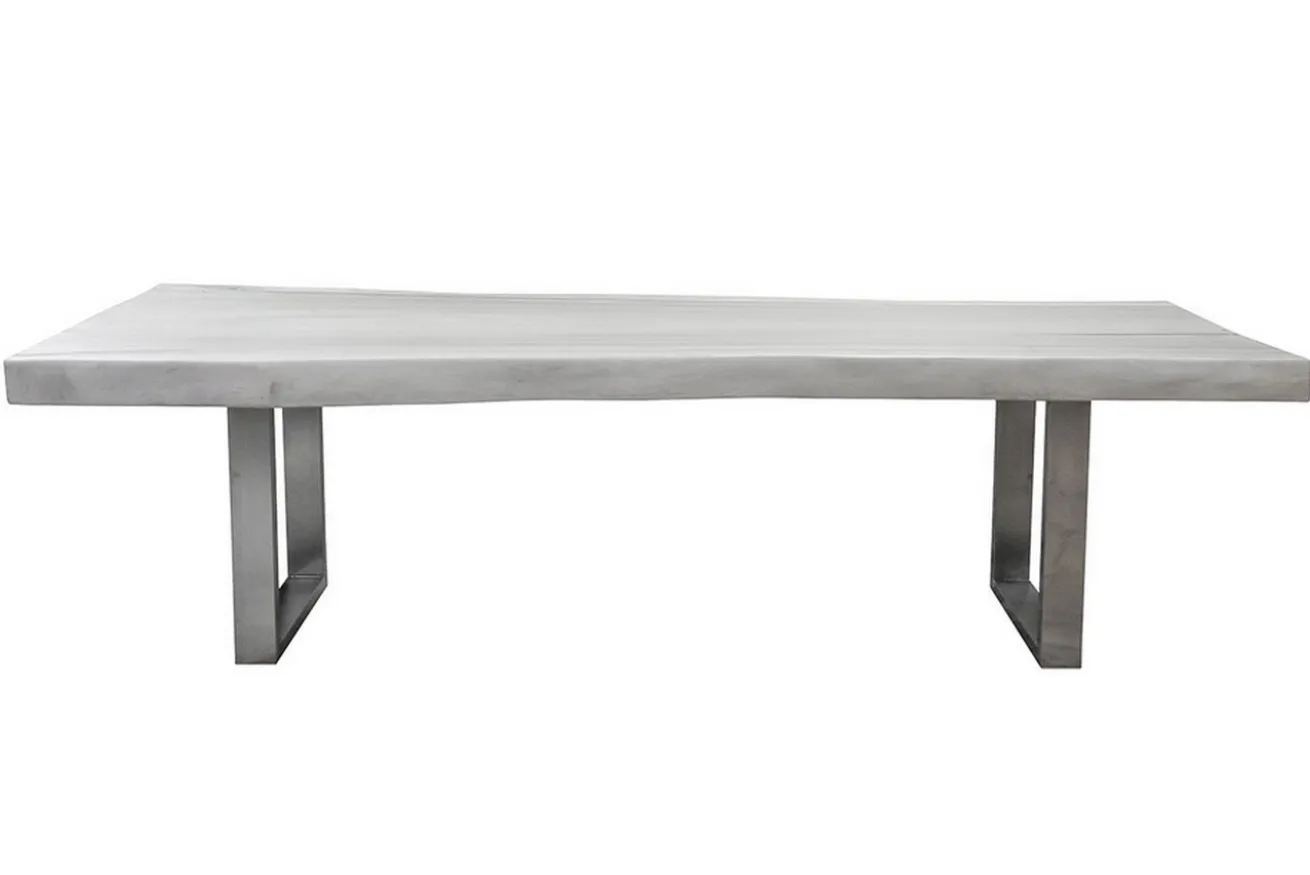 Ein absolutes Einzelstück ist dieser Designer Tisch, denn er ist aus einer einzigen 300 cm langen und 10 cm dicken Suar Holzplatte gefertigt. Suar Holz nennt man auch asiatische Eiche. Da die Platte eine Breite von 300cm und eine Tiefe von 90-100cm hat, kann davon ausgegangen werden, dass es sich um einen 40-60jährigen Baum handelt, dessen Baumscheibe wir für einen Holztisch verwenden. Die Oberfläche wurde aufwändig veredelt und weiss pigmentiert, so dass dieser Massivholztisch seinen modernen Look erhält. Der Tisch, der sich für riesige Esszimmer eignet und eigentlich eher eine Speisetafel ist, wird von zwei Füßen aus dickem Edelstahl in U-Form getragen. Dank seines Aussehens passt das Massivholzmöbel in sehr modern eingerichtete Milieus.