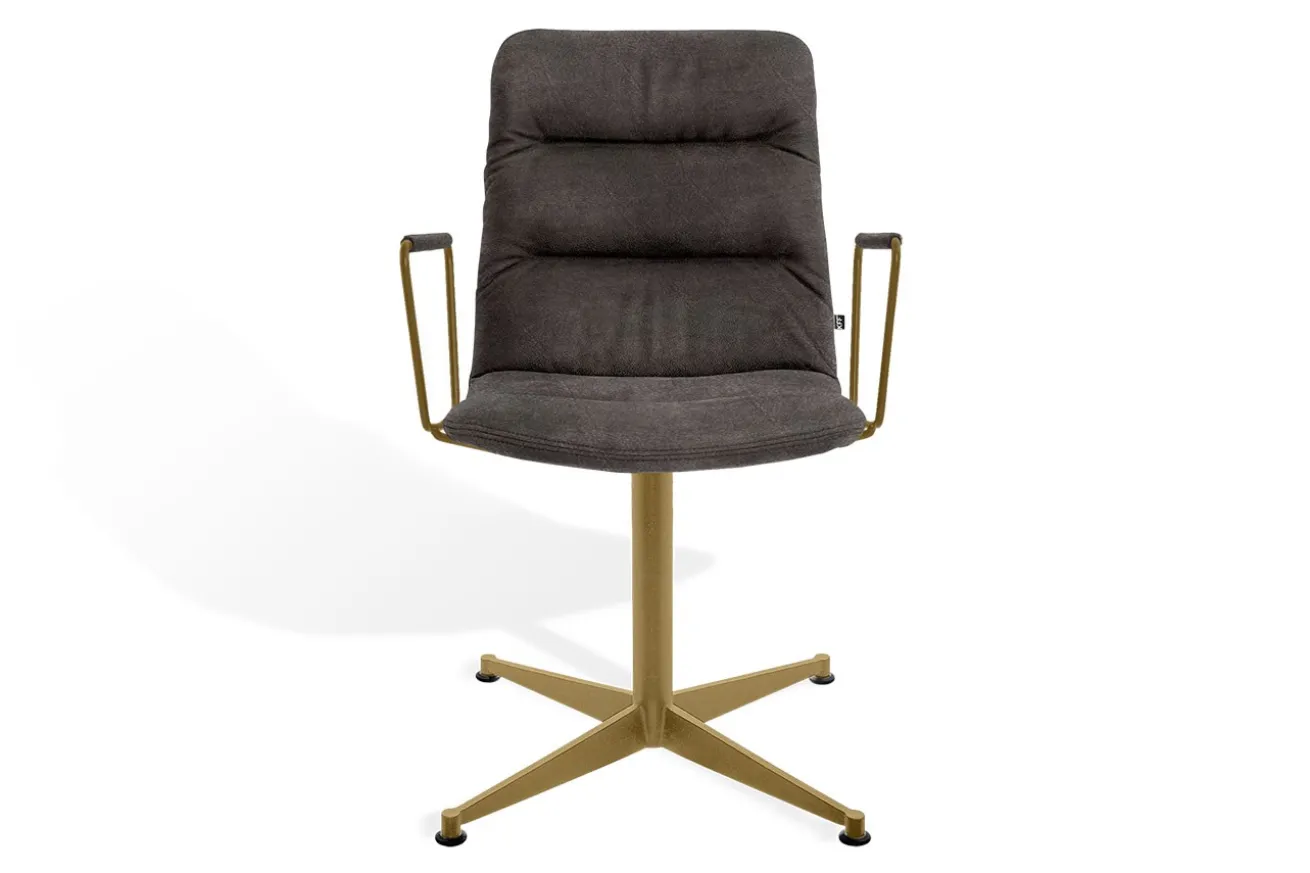 Das messingfarbene 4-Fuß-Sterngestell bildet einen kontrastreichen Abschluss und sorgt für ein stabiles, zugleich luxuriös wirkendes Fundament. Dank seiner drehbaren Funktion bleibt der Stuhl flexibel und bietet eine mühelose Bewegungsfreiheit – ideal für lange Gespräche oder dynamische Tischrunden.