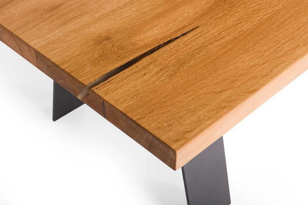 Die Risse und Astlöcher werden mit einer 2 Komponenten Holzspachtel sorgfältig ausgegossen und im Anschluss mehrfach verschliffen. Diese Varianten werden oft als eine zusätzliche Art der farblichen Gestaltung eingesetzt. Hierdurch erfährt die Tischplatte eine Betonung seiner Natürlichkeit und wird noch individueller. Diese Variante fällt optisch deutlicher ins Auge als die elegante Alternative durch die Epoxiverfüllung.