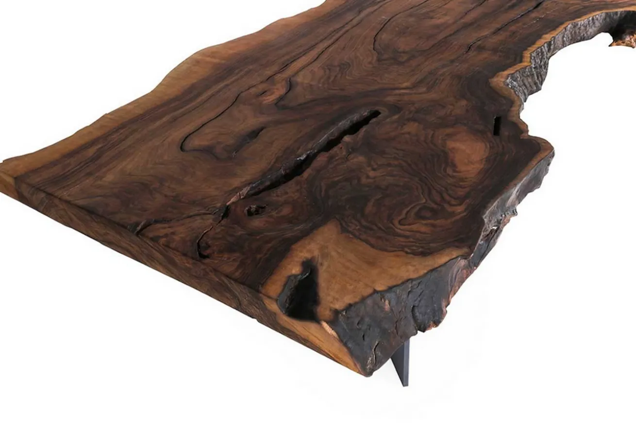 Die Tafel hat die Maße Breite 213cm, Länge 66-100cm und Höhe 79cm (samt Beinen) und dient dank ihrer organischen Kante samt schwarzen Beinen aus Metall, die vier an der Zahl sind, einfach als Hingucker. Vor allem dank der geölten Oberfläche, deren ursprüngliche Maserung und Farbe erhalten bleibt, kann so ein Esstisch in sehr modernen, aber auch rustikal gehaltenen Milieus nur wunderbar aussehen. Wie wäre es mit den passenden Stühlen aus Leder und einer Lampe im Loftstil, bei der eigentlich die Glühbirnen der Hingucker sind? Dekorieren und richten Sie den neuen Tisch für Ihr Esszimmer nach Ihren Wünschen ein, dieser europäische Nussbaumtisch lässt alles mit sich machen.
