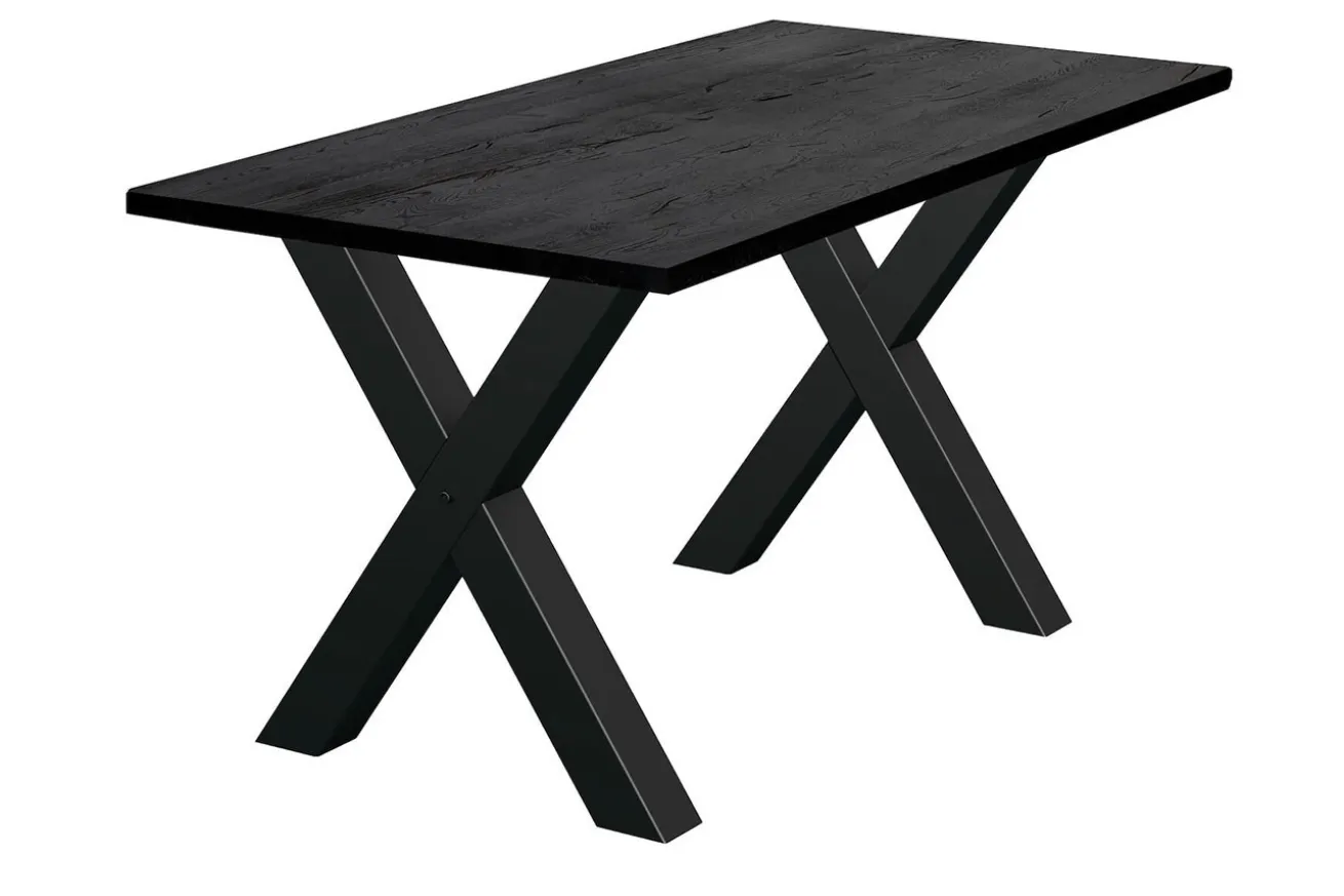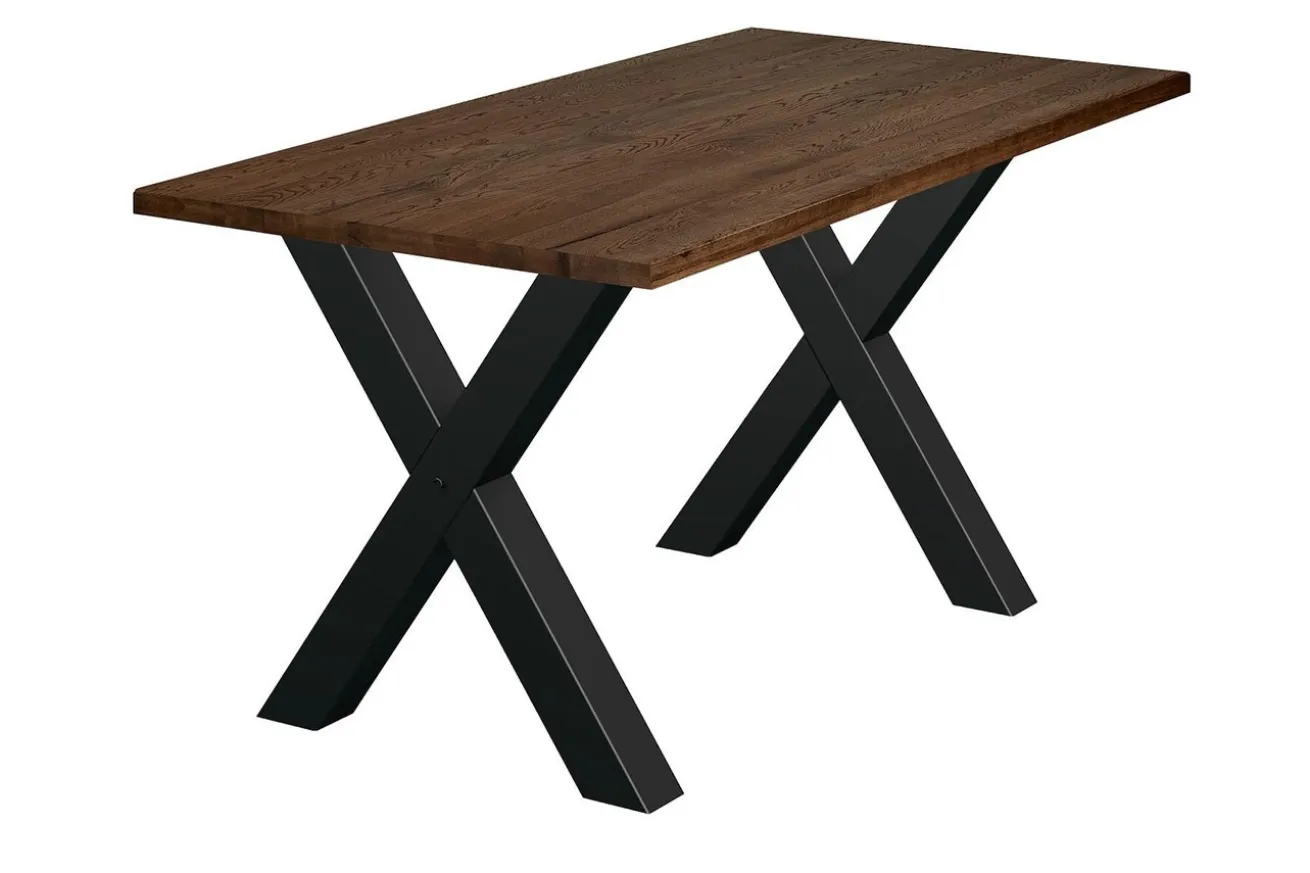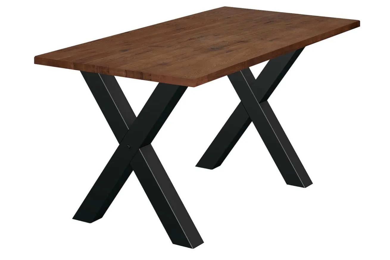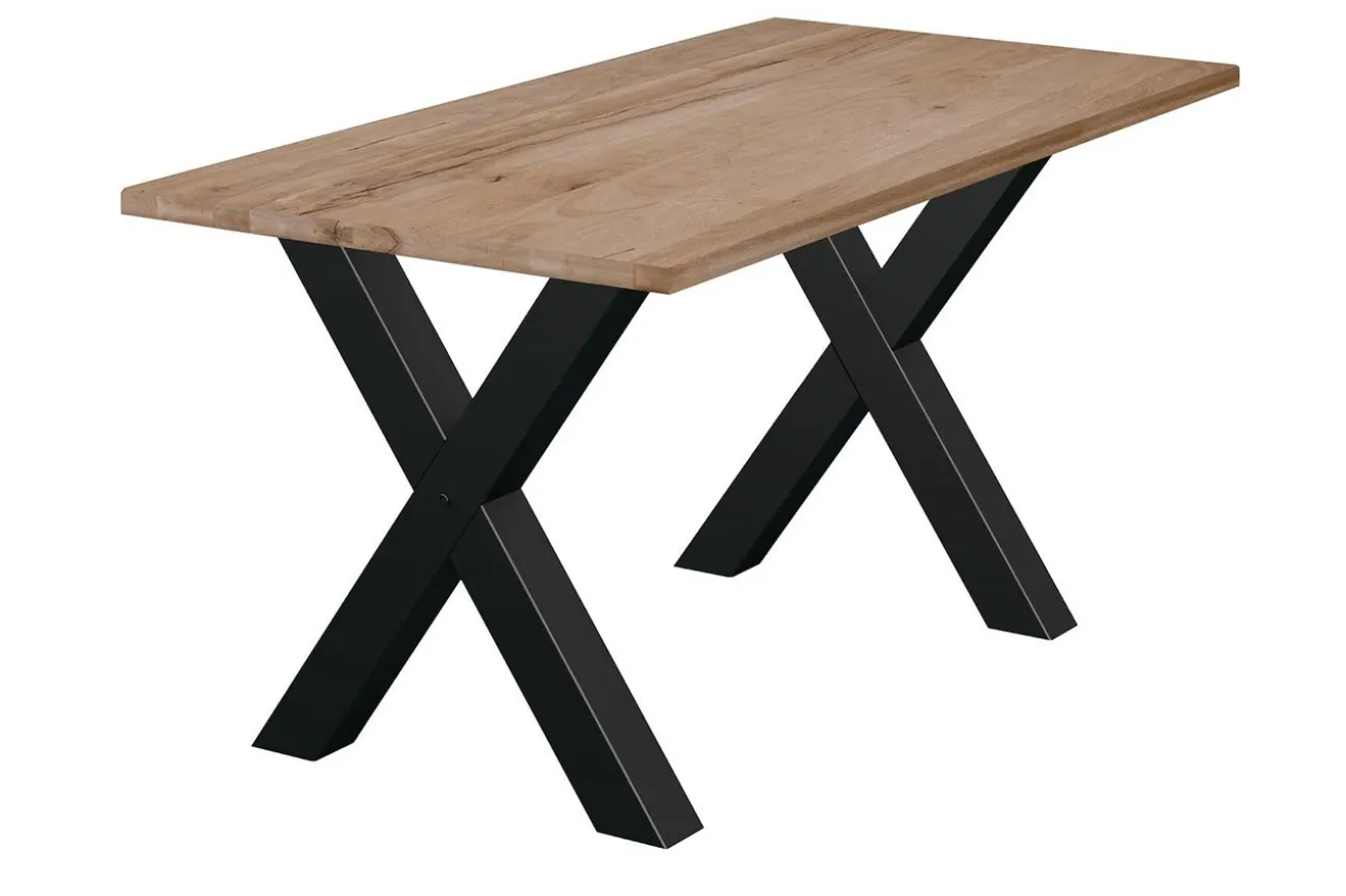 Die lackierte Oberfläche schützt das Holz und betont seine natürliche Schönheit, während die X-förmigen Füße aus robustem Metall in eleganter Schwarznuance dem Tisch einen modernen Touch verleihen. Diese markante Formgebung verleiht dem Tisch nicht nur Stabilität, sondern auch einen einzigartigen ästhetischen Reiz, der ihn zum Blickfang in Ihrem Essbereich macht.