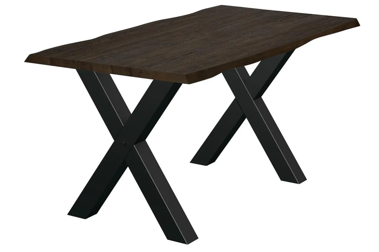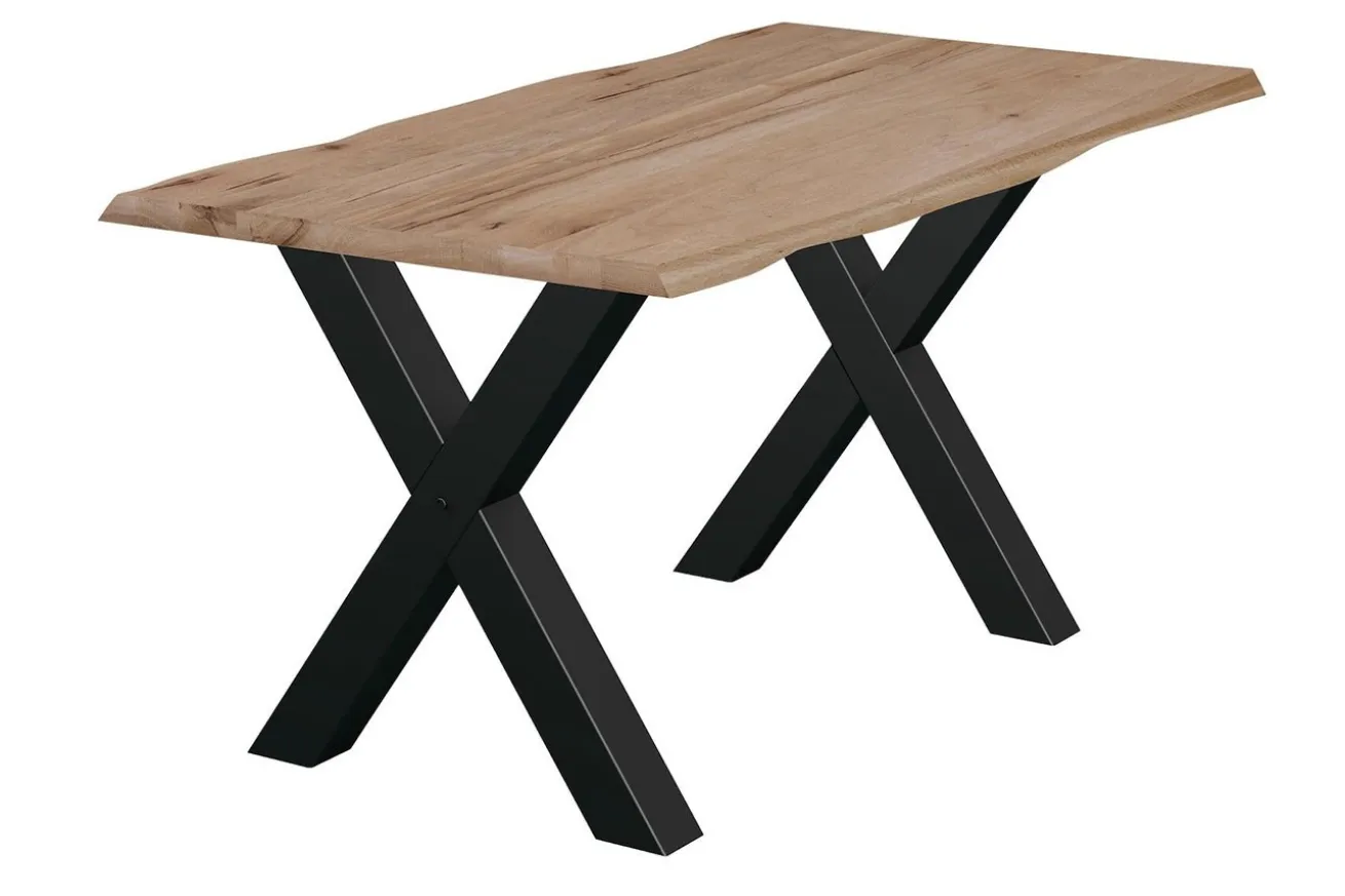 Die x-förmigen Füße aus robustem Metall in elegantem Schwarz setzen einen faszinierenden Kontrast zur natürlichen Holzplatte und verleihen dem Tisch eine moderne Ästhetik. Ihre stabile Konstruktion gewährleistet eine solide Standfestigkeit und verleiht dem Tisch gleichzeitig eine markante visuelle Präsenz.