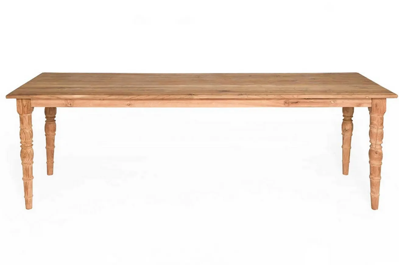 Bei diesem im Landhausstil gefertigten Möbelstück aus dem Massivholz Teak können wir nicht wiederstehen und müssen mit unseren Fingern drüberfahren. Naturfarbenes, recyceltes Holz, dessen Einzelteile vorher bereits ein anderes Möbelstück geschmückt haben, verarbeitet zu einem rechteckigen Küchentisch, der nicht nur rustikal aussieht, sondern eben dieses Flair versprüht. Wie gern würden wir uns mit passenden, vielleicht filigranen, vielleicht breiten und gepolsterten Stühlen in bunten Farben wie pink, blau oder gelb dransetzen und unsere Seele baumeln lassen. Mit einer Tiefe von 100cm, einer Breite von 220cm und einer Höhe von 79cm sowie einer Plattenstärke von 3,5cm bietet der einladende Esszimmertisch Platz für alle. Einfach mal dransetzen und entspannen. Ob bei einem ausgiebigen Frühstück mit der Familie, bei welchem die Sonne auf die unbehandelte Oberfläche scheint, oder aber für fünf Minuten zwischen intensiven Arbeitsphasen, wenn Sie dieses massive Möbelstück zu einem Schreibtisch umfunktionieren. Mit Brasserie ist alles möglich.