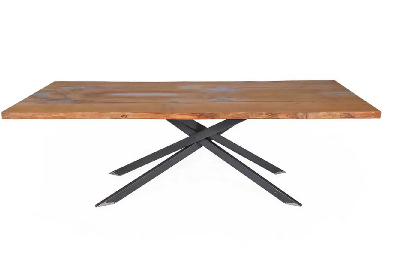 Dieser wunderschöne Esstisch besteht aus einer geölten Eichenplatte sowie einem Gestell aus Rohstahl. Das Massivholzmöbel hat eine Breite von 243cm, eine Tiefe von 105cm und eine Höhe von 76cm. Das sehr begehrte Holz für Möbel hat eine organische Kante. Aber das ist nicht die einzige Besonderheit dieses Möbelstücks aus Eichenholz, denn die Tischplatte besteht aus zwei Teilen, also zwei Bohlen, die so zusammengesetzt sind, dass sie gespiegelt sind. Dadurch erhält die ohnehin schon besondere Platte einen noch unikateren Charakter, vor allem durch die dunkle, teilweise schwarze Maserung. Die natürlich-warme Farbgebung wird von den gut erkennbaren Jahresringen unterstrichen. Getragen wird die Massivholzplatte mit schwarzer Maserung von schwarzen Tischbeinen aus Rohstahl, die dem Mehrzwecktisch einen besonders rustikalen Touch verleihen. So lässt sich das Masivholzmöbel mit seiner Größe in Esszimmer oder große Küchen im Industrialstil integrieren.