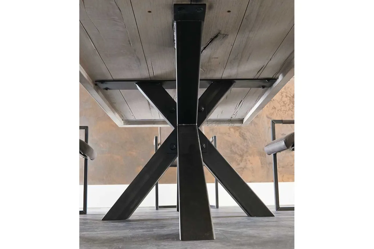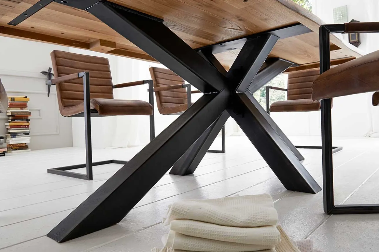 Der Tisch ruht auf einem soliden Mittelfuß in eleganter Schwarz-Finish. Diese Kombination aus rustikalem Eichenholz und schwarzem Metall verleiht Ihrem Esszimmer eine zeitgemäße Note und sorgt gleichzeitig für die nötige Stabilität.