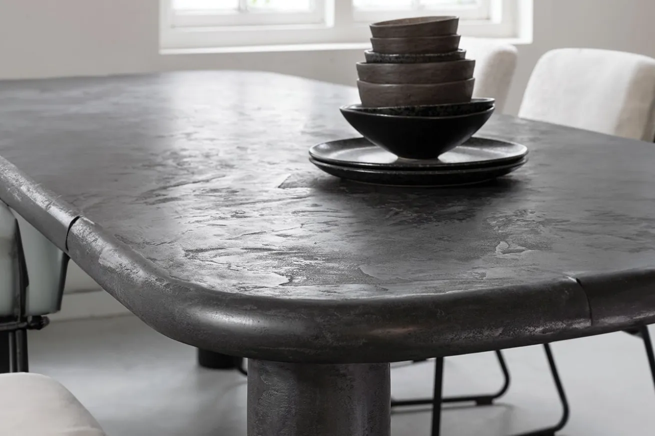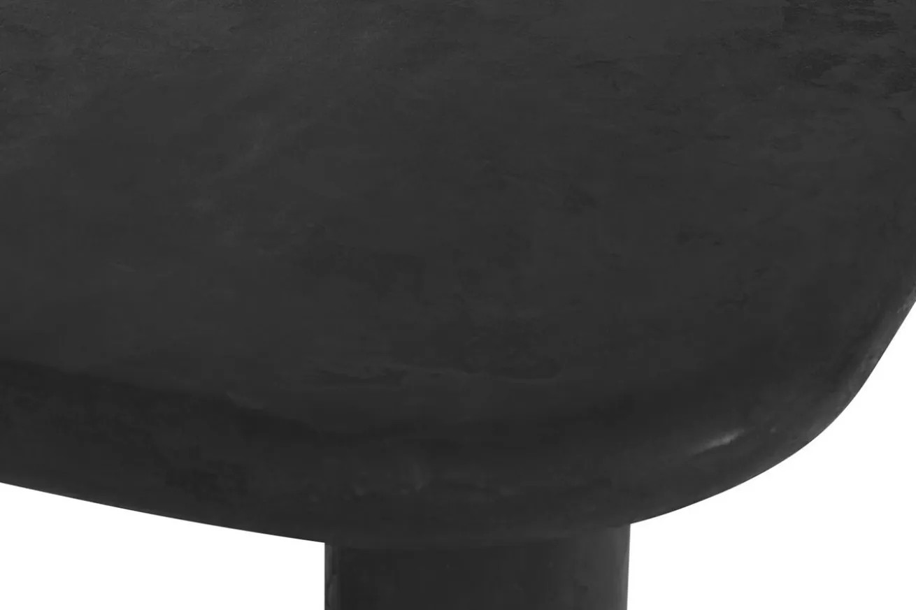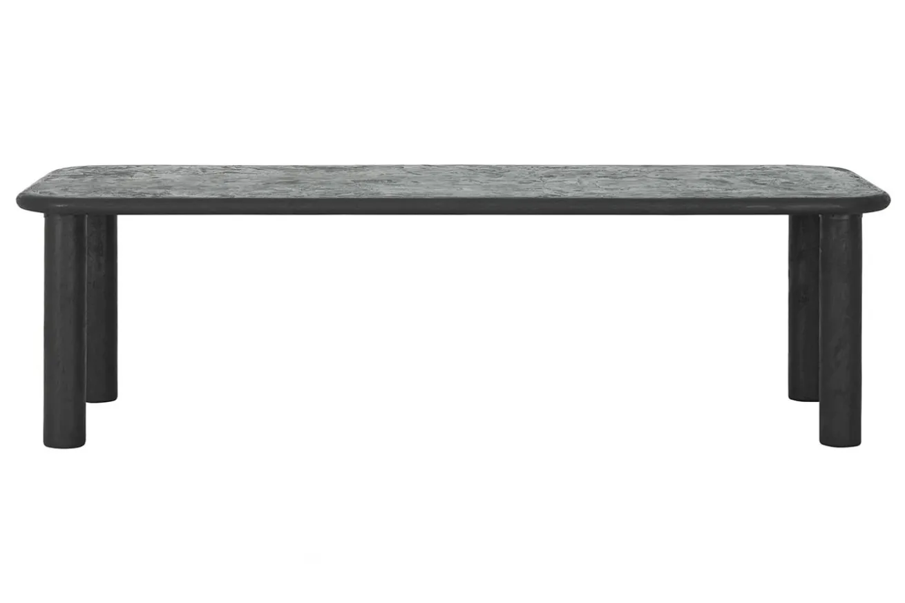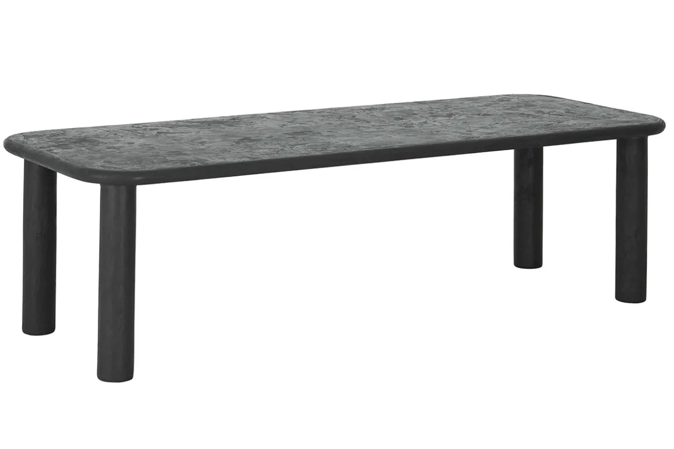 Die Tischplatte, sowie alle vier Füße des Tisches, bestehen aus Mortex in eleganter schwarzer Farbe, was dem Tisch eine markante und zugleich zeitlose Ästhetik verleiht. Die abgerundeten Kanten der Tischplatte verleihen ihm eine weiche und einladende Silhouette, während die runden und säulenförmigen Füße eine stabile Basis bilden und dem Tisch einen Hauch von Raffinesse verleihen.