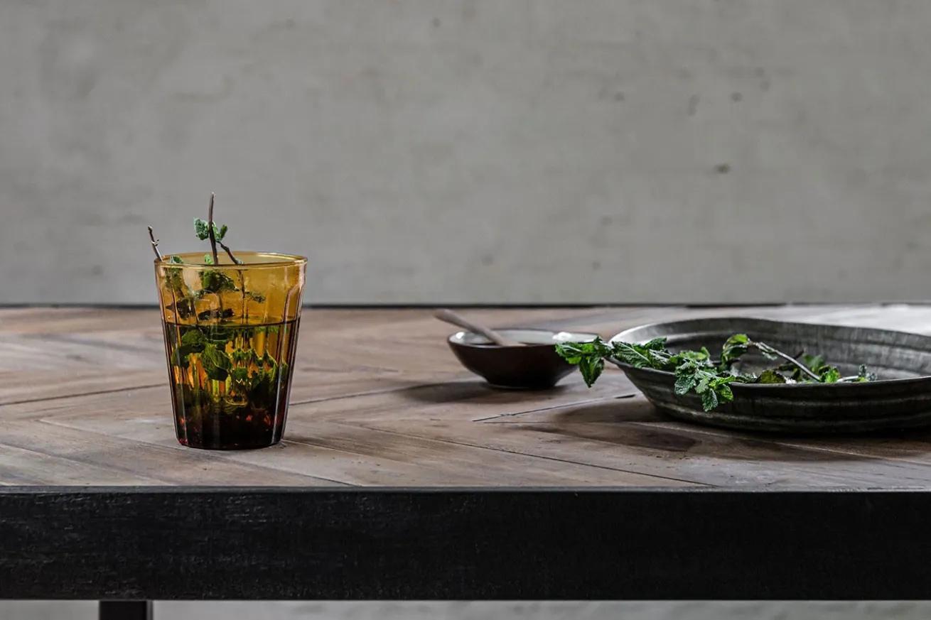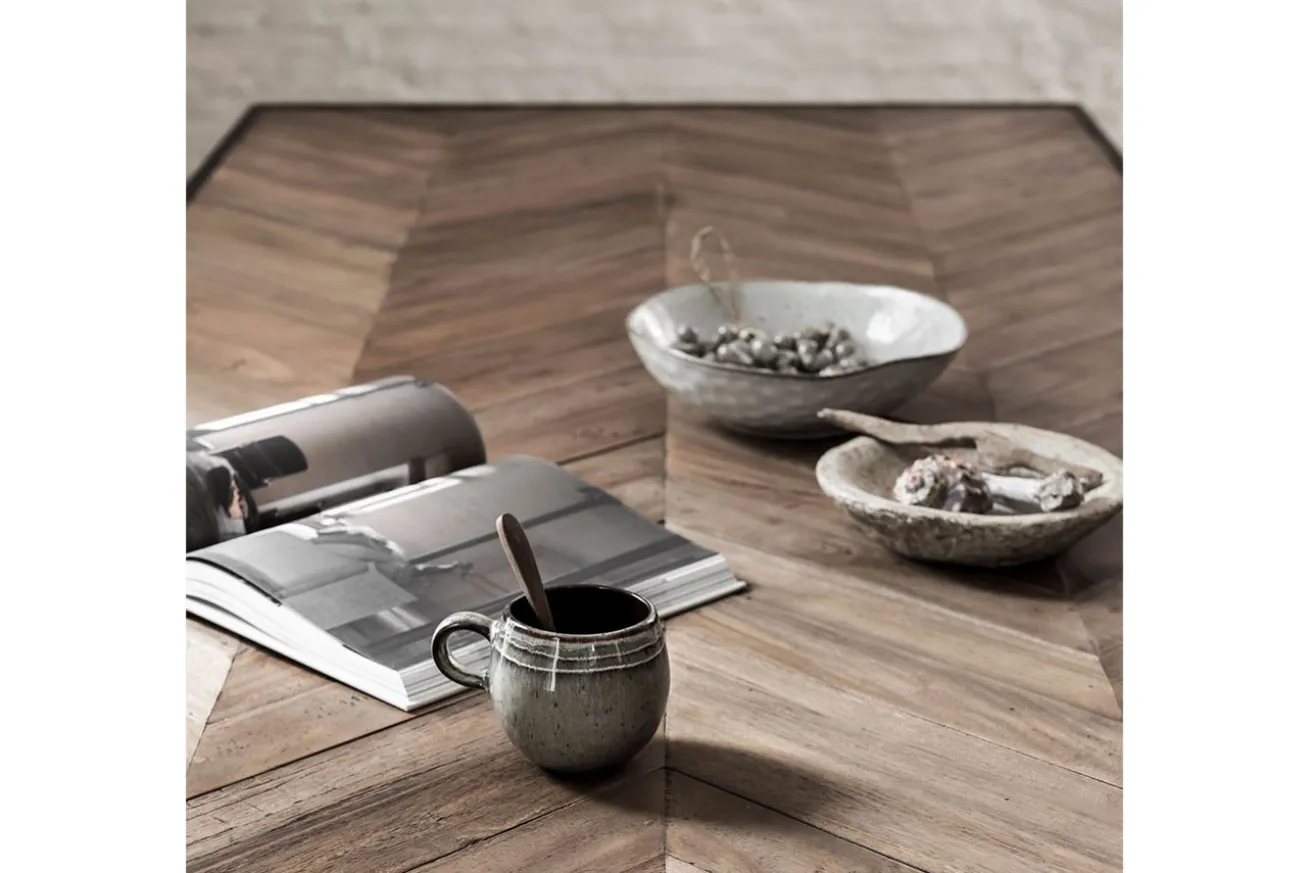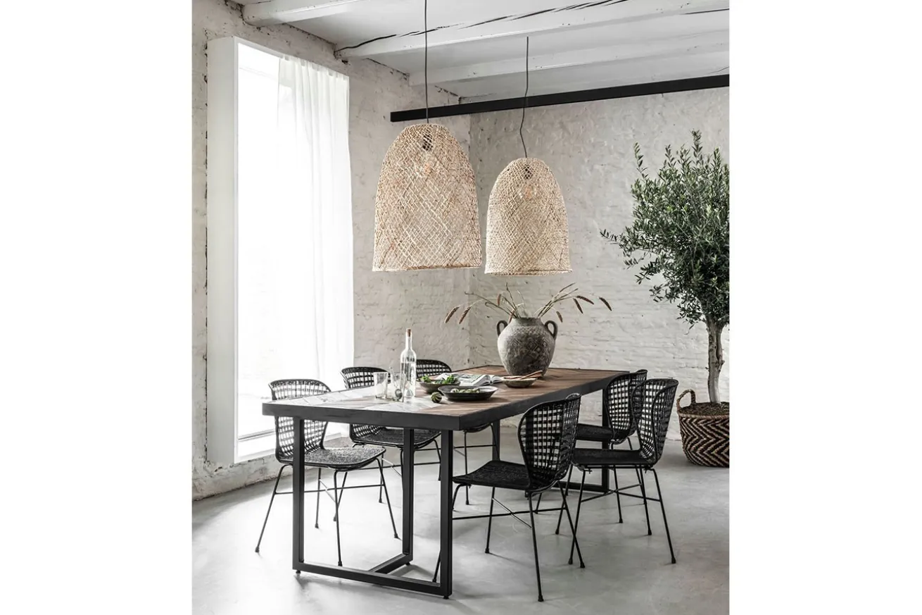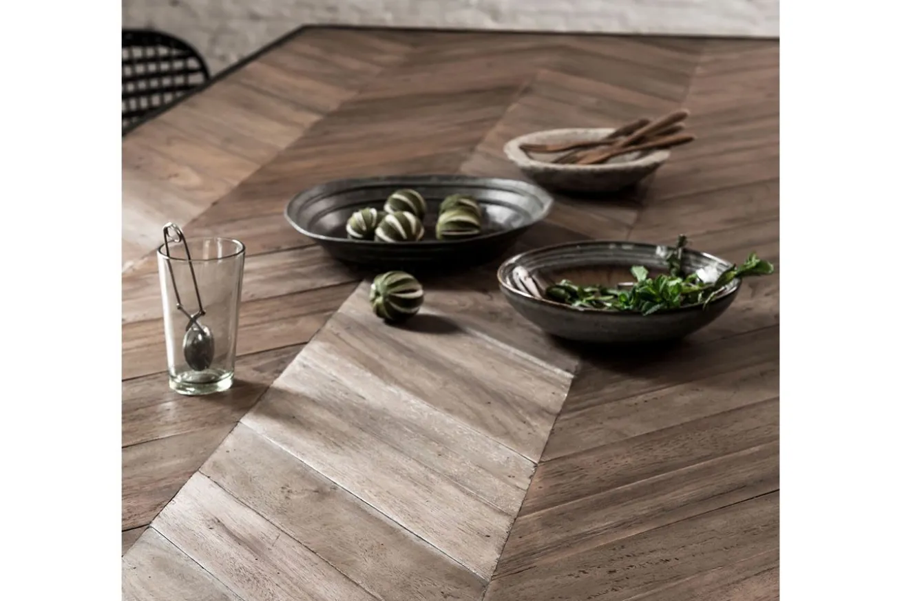 Egal, ob Sie kulinarische Abenteuer erleben oder Freunde und Familie bewirten, dieser Esstisch wird zum Mittelpunkt Ihres Essbereichs im Ethno-Stil. Die Kombination aus der fesselnden Fischgrätoptik und dem schwarzen Metallgestell schafft ein einzigartiges visuelles Erlebnis, das Geschichten vergangener Zeiten erzählt und dennoch perfekt in moderne Räume passt. Erwecken Sie den Ethno-Look in Ihrem Zuhause zum Leben und bringen Sie Tradition und Moderne in perfekte Harmonie.