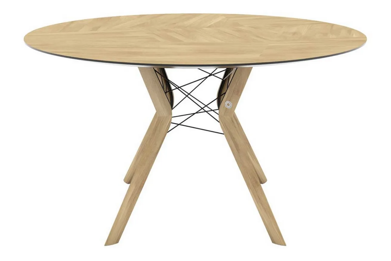 Wir wissen nicht, ob es die Natürlichkeit oder die Authentizitiät des Tisches ist, aber wir können uns nicht entscheiden, was an dem Holztisch uns besonders gut gefällt. Vielleicht ist es auch alles zusammen. Unser Produkt hat einen Durchmesser von 110cm und eine Höhe von 76cm. Die Platte ist eine Multiplexbasisplatte aus 0,6mm dicken Furnier im Stil von Eichenholz im Mosaikmuster. Der Tisch eignet sich dank seines üppigen Durchmessers in relativ große Esszimmer. Getragen wird diese von vier Holzfüßen. Gemischte Holz- und Metallfüße mit unstrukturierten Linien, die an die Cozy-Stühle erinnern, sind auch hier zu finden. Der Eco-Tisch verkörpert den Wunsch nach Leichtigkeit.