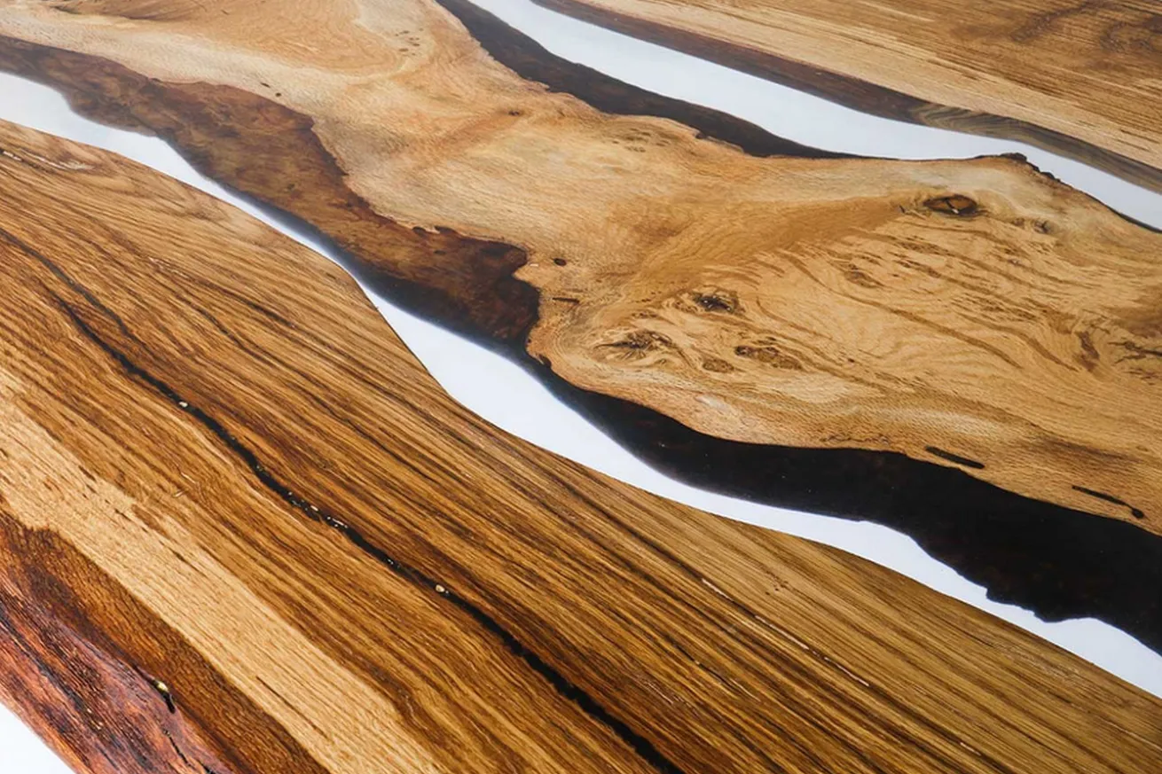 Die Tischplatte besteht aus Eichenholz, die am häufigsten in Europa vorkommende Baum- & Holzart in Deutschland. Durch ihre Härte und Widerstandsfähigkeit hat sie sich schon früher im Hausbau besonders gut etabliert. Warum daraus nicht dann auch eine Platte herstellen? Die Tischplatte hat eine Stärke von 6cm und eine organische Kante, was bedeutet, dass der Rand nicht abgeschliffen wurde, sondern seine natürlichen Kurven behalten durfte. Die natürliche Farbe mit der gleichmäßigen Maserung haben wird beibehalten. Allerdings wurde die Oberfläche des Massivholzmöbels geölt und Astlöcher sowie Harzkanäle haben wir mit transparentem Gießharz verfüllt. Dadurch wirkt die Massivholzplatte noch besonderer und die Maserung kommt besser zur Geltung.