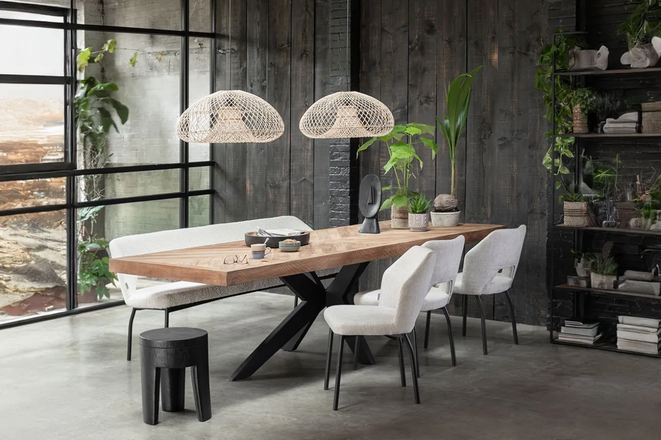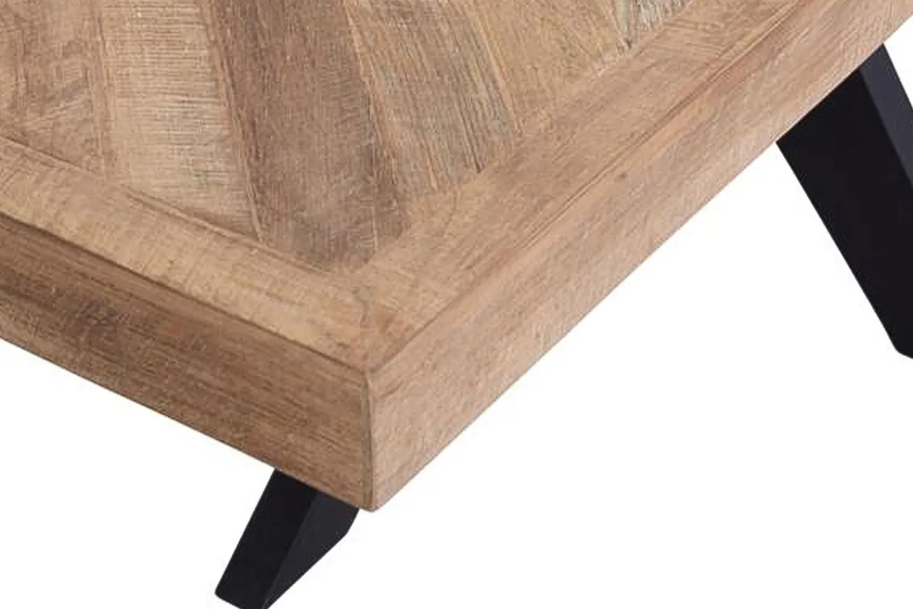 Erleben Sie die Schönheit der Natur in Ihrem Essbereich mit unserem rechteckigen Esstisch, der mit einer Teakholztischplatte in Fischgrätoptik verzaubert. Dieses Meisterwerk des Handwerks kombiniert die zeitlose Eleganz von Teakholz mit einem modernen Twist, der Ihrem Raum eine einzigartige Ausstrahlung verleiht.