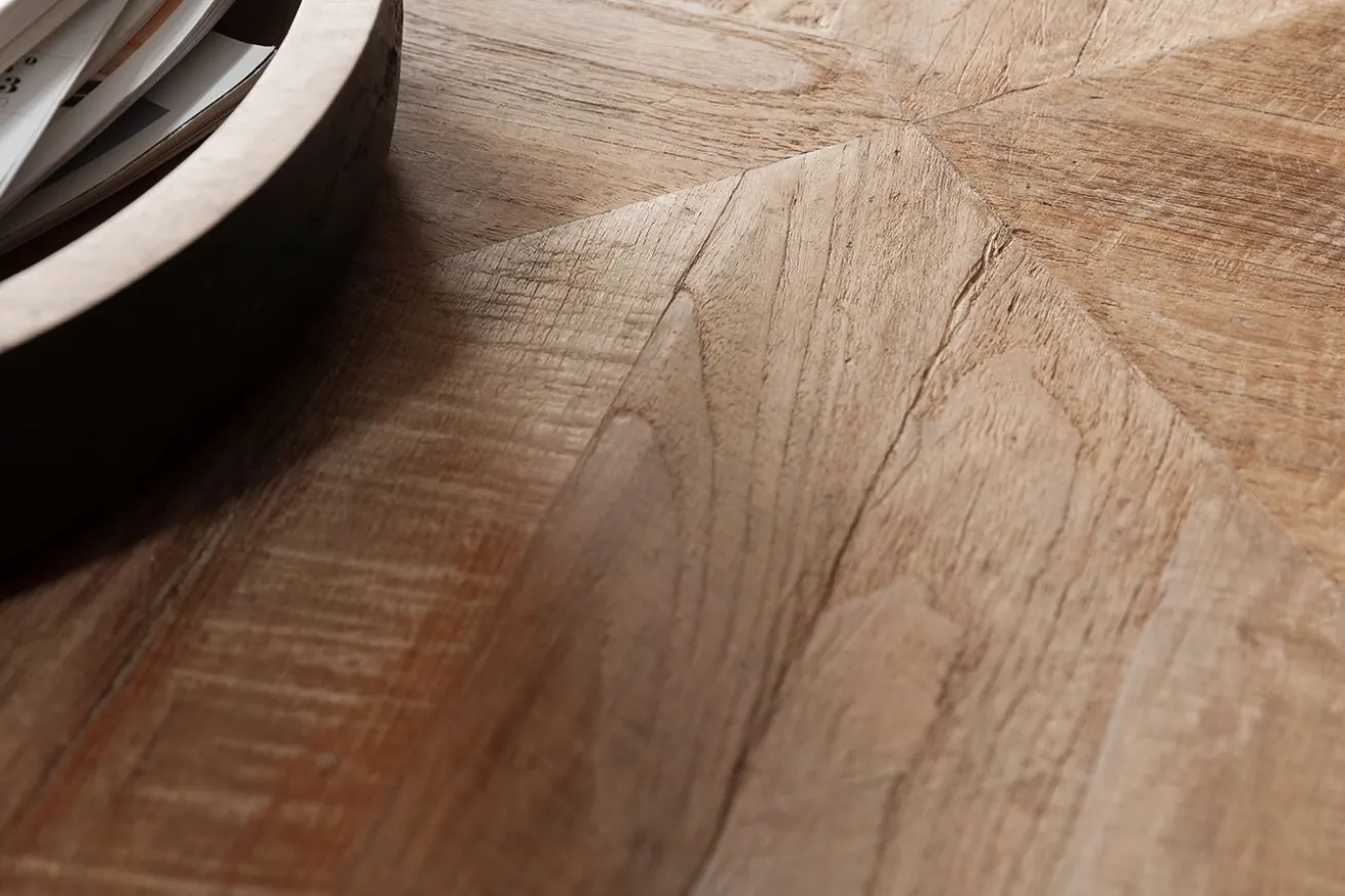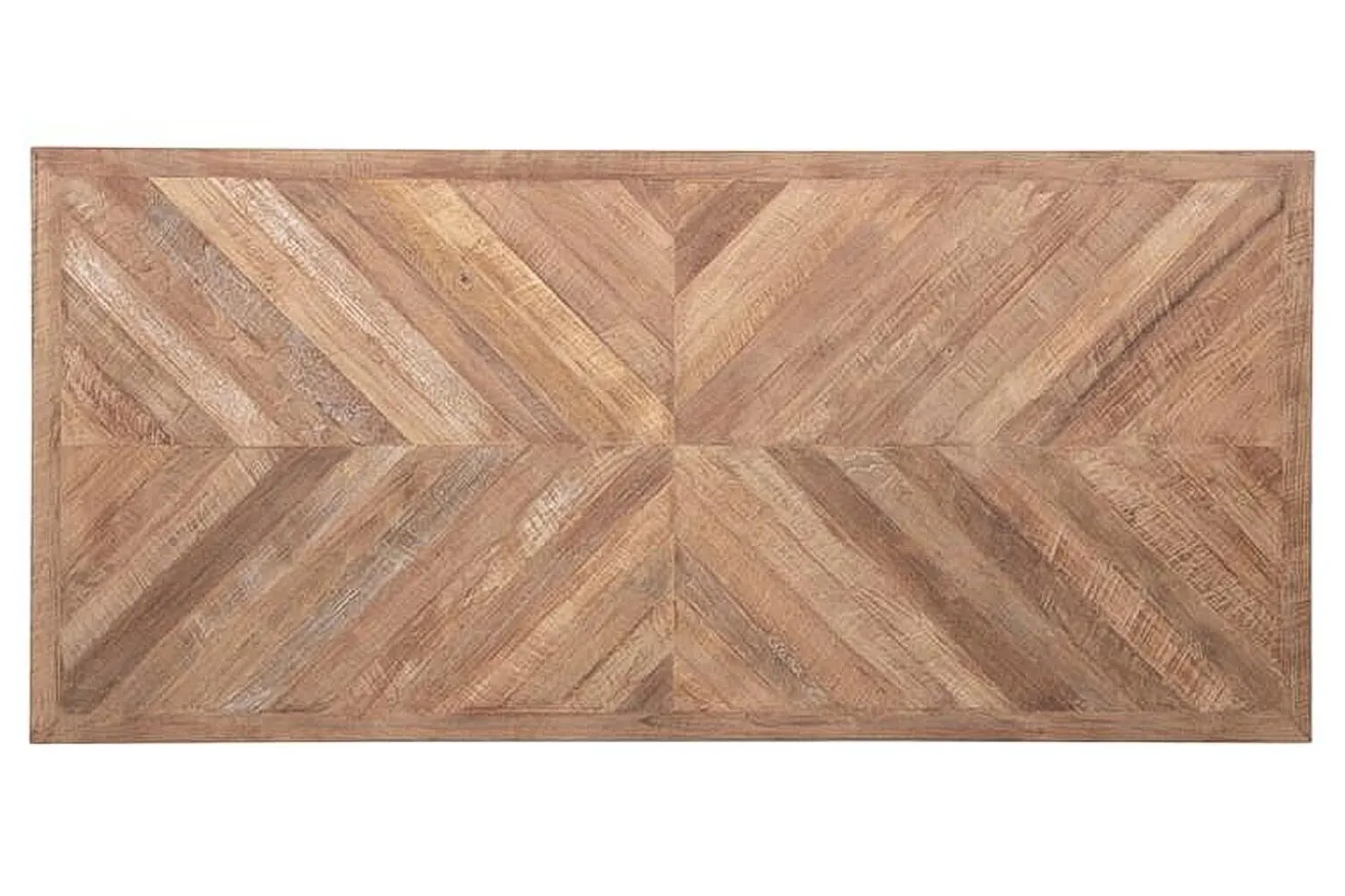 Die Tischplatte, die in einer naturfarbenen Fischgrätoptik gestaltet ist, fängt die natürliche Schönheit des Teakholzes ein und bringt sie voll zur Geltung. Jedes Detail erzählt eine Geschichte und verleiht Ihrem Essbereich einen Hauch von rustikalem Charme und zeitloser Eleganz.